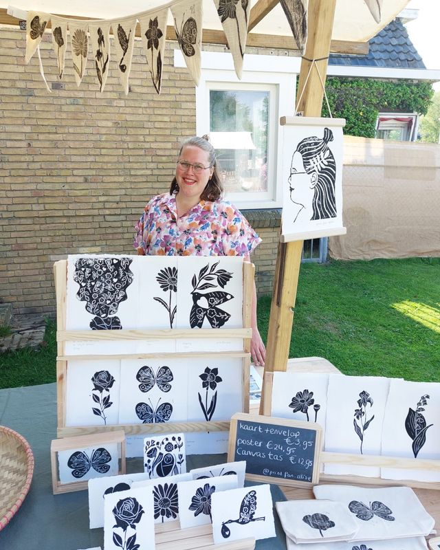 Alise begeleidt je bij het snijden van de linosnede. Ze helpt bij het bepalen welke vlakken blijven staan en welke worden weggesneden. Daarna begeleidt zij het drukken van de kaarten met zwarte block printing inkt.