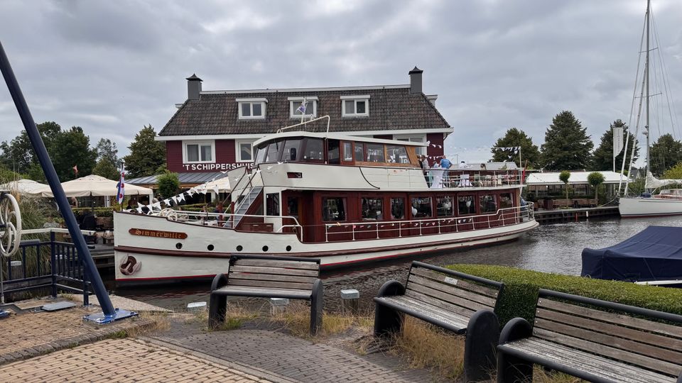 Das Schiff liegt im Wasser vor dem Imperial Tabacco am Slachtedyk 28a in Joure. Parken ist auf dem angegebenen Parkplatz möglich (Schild P Brouwer Rondvaarten).