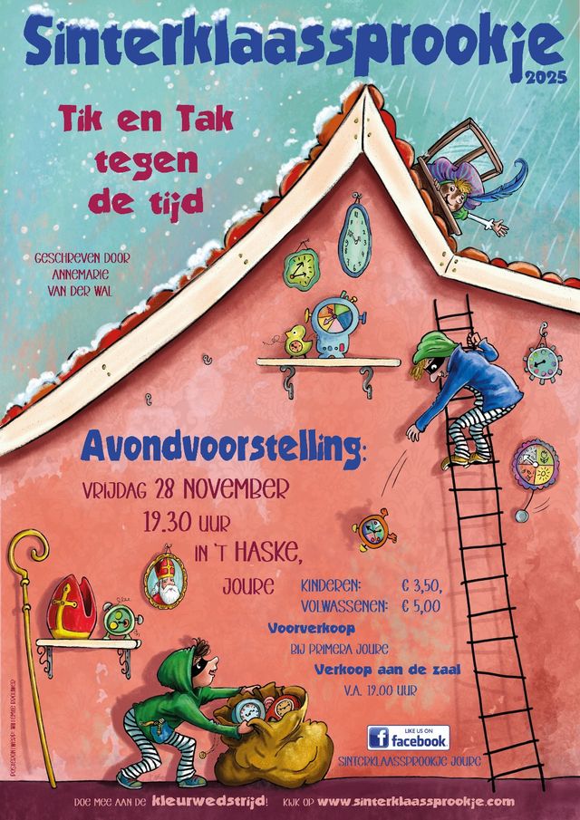 Dit jaar brengt het Sinterklaassprookje een nieuw verhaal: “Sinterklaas en Mevrouw Jaargetijde”. Sinterklaas logeert in de klokkenwinkel van Mevrouw Jaargetijde, maar twee lieve boeven hebben het op haar klokken gemunt. Of dat goed afloopt? Dat zie je op vrijdag 28 november in ’t Haske in Joure.