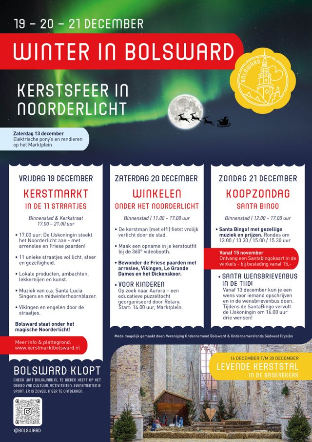 Maak een opname in je kerstoutfit bij de 360 graden spinner videobooth. Bewonder de Friese paarden met arreslee. Ontmoet Vikingen en Le Grande Dames. Geniet van het Dickenskoor. Voor kinderen is er vanaf 14.00 uur een speciale puzzeltocht door de binnenstad (op zoek naar Aurora; een educatieve puzzeltocht, georganiseerd door Rotary Bolsward).