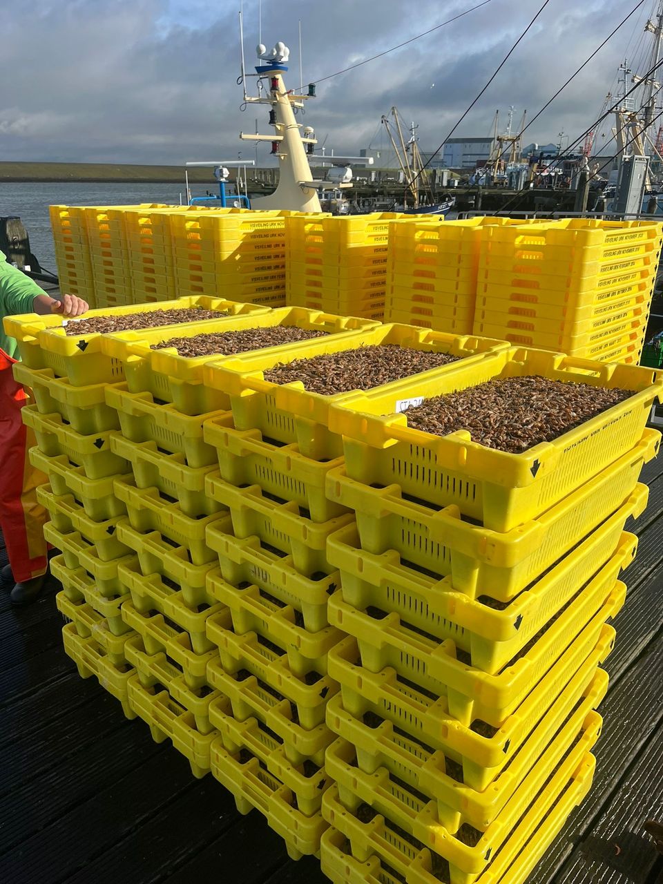 Hollandse garnalen (om zelf te pellen) met panna cotta van schaaldieren, groene appel, radijs & schuim van cocktailsaus