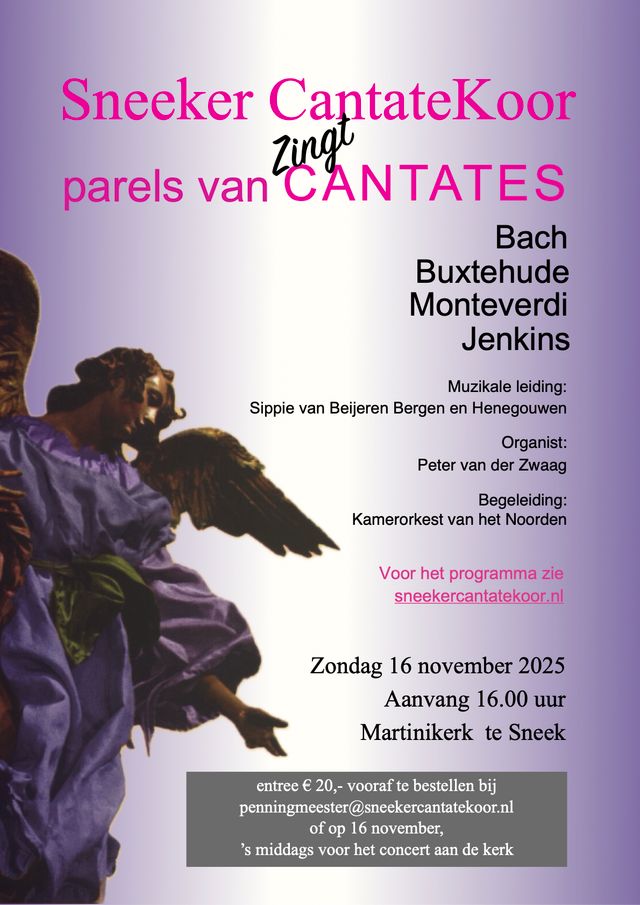 Het Sneeker CantateKoor zingt Parels van Cantates. Op zondag 16 november 2025 brengt het Sneeker CantateKoor een gevarieerd concert in de Martinikerk van Sneek, onder de titel "Parels van Cantates". Aanvang 16.00 uur.