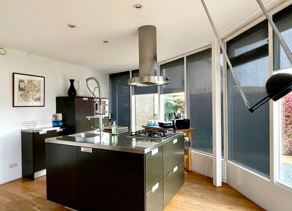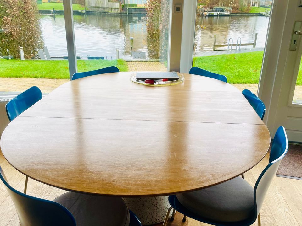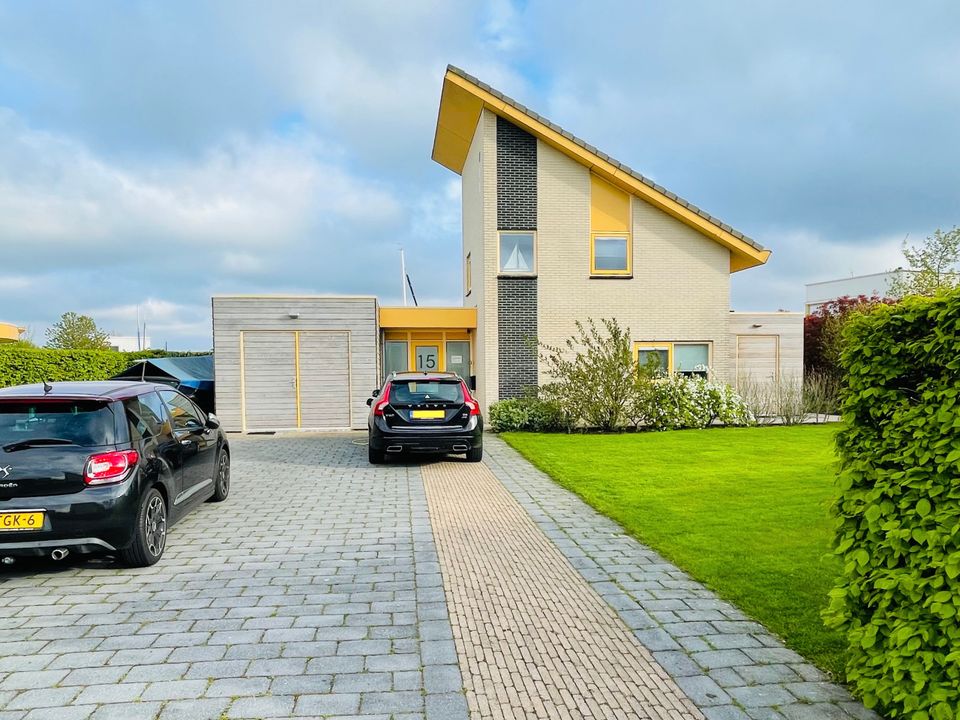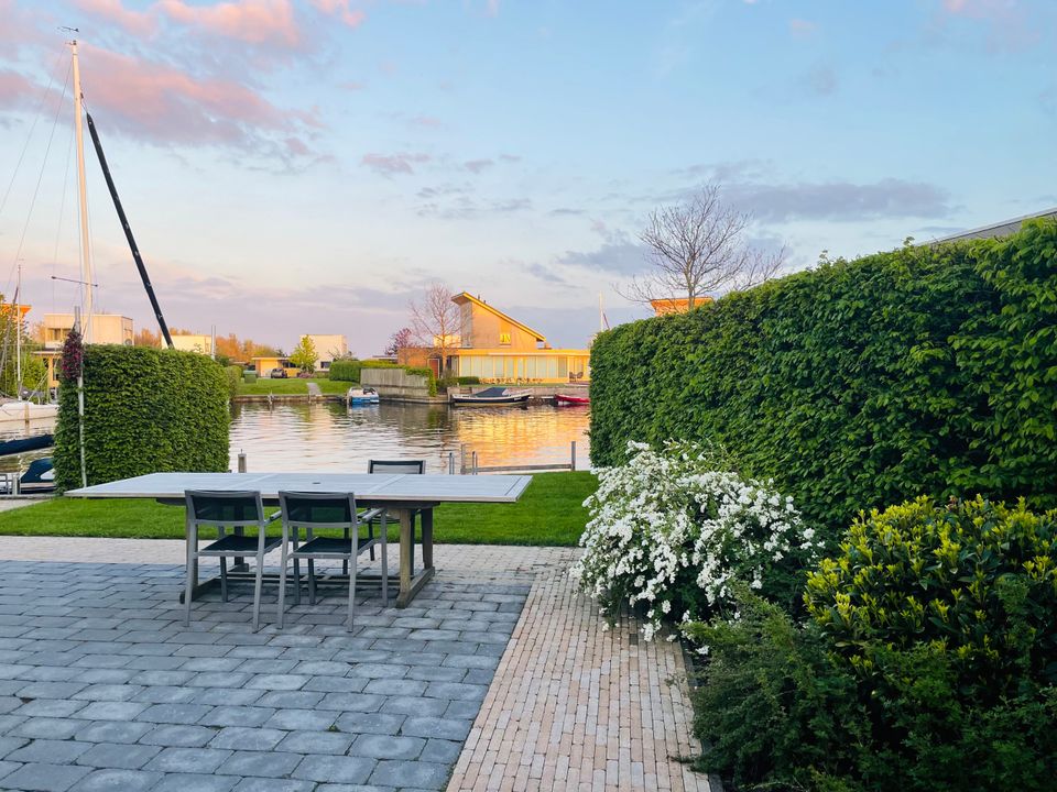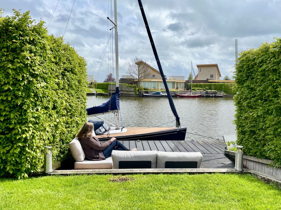 Der Garten hat zwei Terrassen, von denen eine am Wasser liegt. Der große Garten ist von Hainbuchen umgeben, sodass Sie viel Privatsphäre haben. Das abgesenkte Deck auf dem Steg vermittelt ein Gefühl des direkten Kontakts mit dem Wasser. Es gibt eine Badeleiter, damit Sie schwimmen können, und eine weitere Plattform, auf der Sie ein kleines Boot zu Wasser lassen können. Wenn Sie im Schatten sitzen möchten, können Sie das Sonnensegel ausrollen oder den großen Sonnenschirm am großen Außentisch aus Teakholz nutzen. An der Anlegestelle kann neben dem Boot des Eigentümers ein (Miet-)Boot mit einer maximalen Länge von 8 Metern und einem Tiefgang von 1,20 m festgemacht werden.