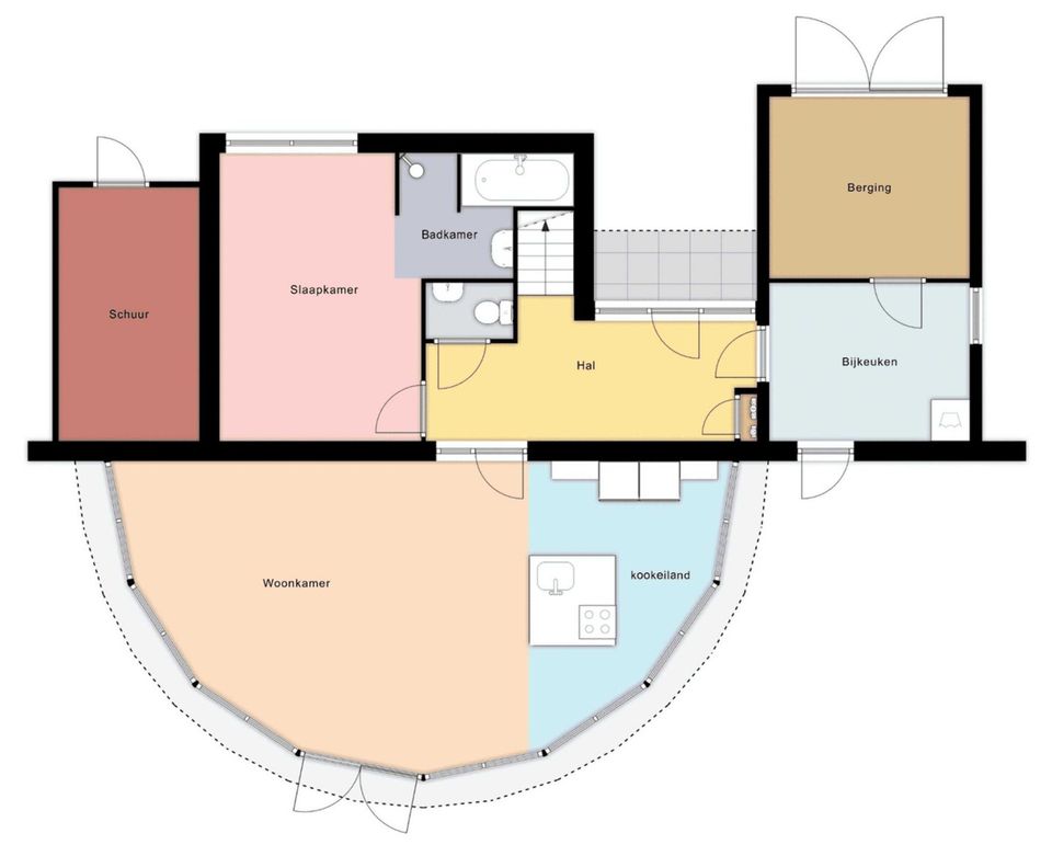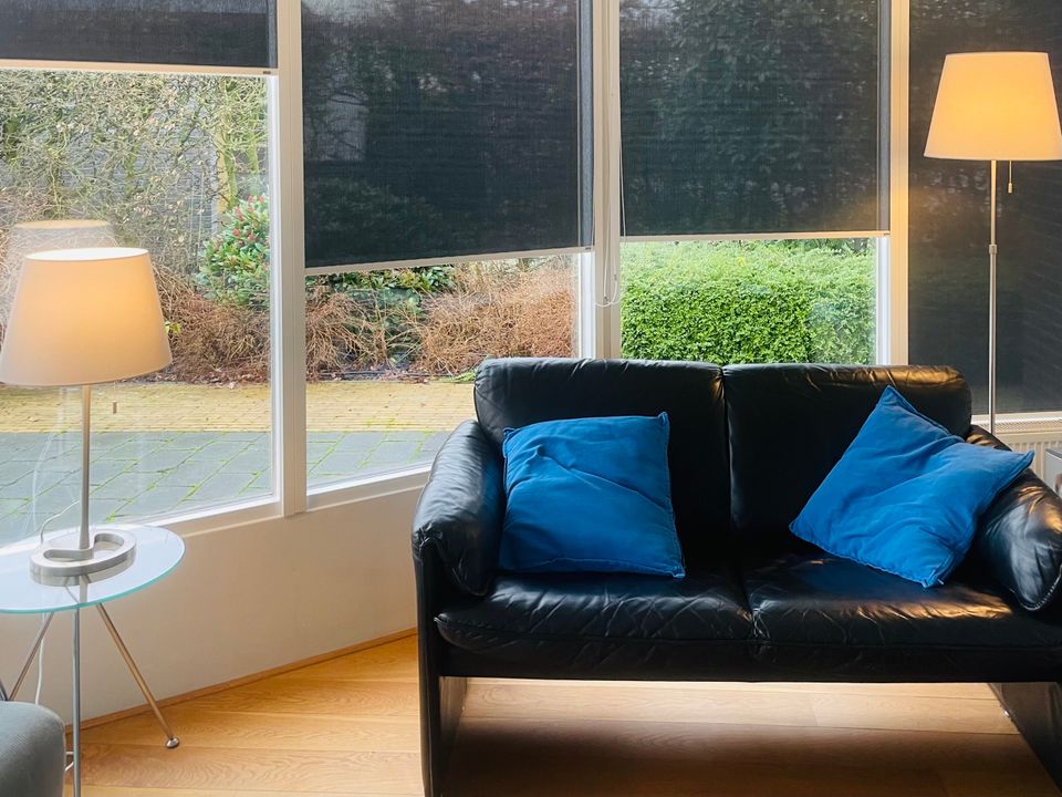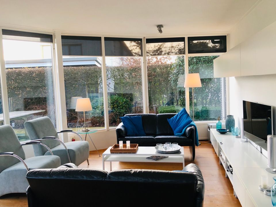 Das halbrunde Wohnzimmer mit vielen Fenstern bietet einen schönen Blick auf den Garten und das Wasser. Vom Wohnzimmer aus gelangen Sie durch die französischen Türen direkt in den sonnigen Garten.