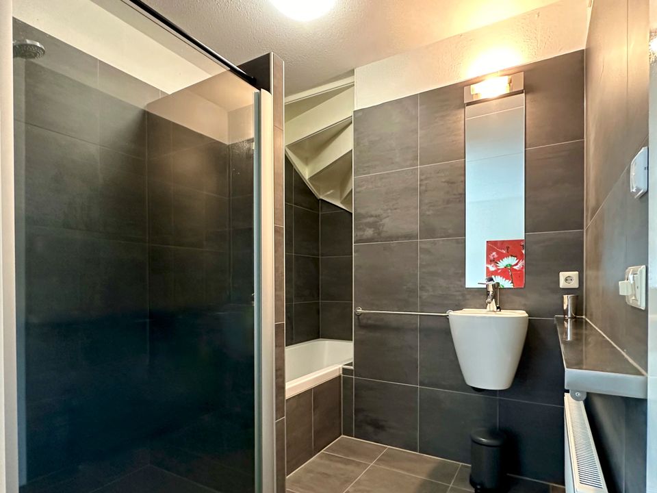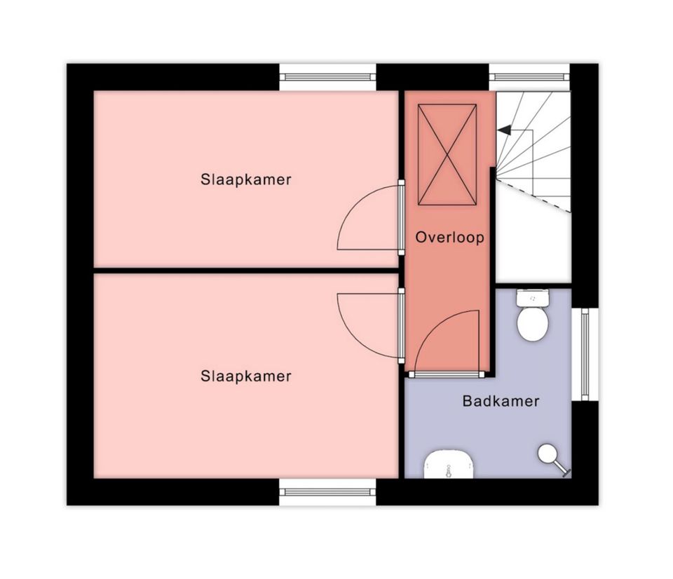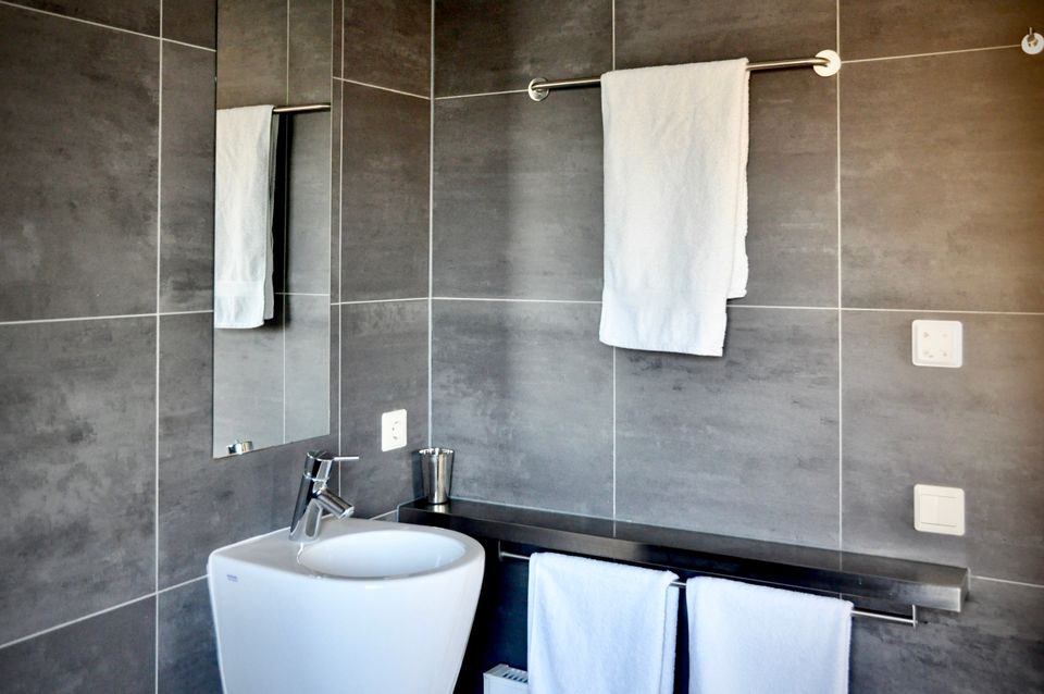 Das Haus verfügt über drei Schlafzimmer, eines davon befindet sich im Erdgeschoss. Dieses „Hauptschlafzimmer“ verfügt über ein eigenes Badezimmer mit Badewanne und Dusche. Im ersten Stock befinden sich die beiden weiteren Schlafzimmer und ein zweites Badezimmer mit Dusche und WC.