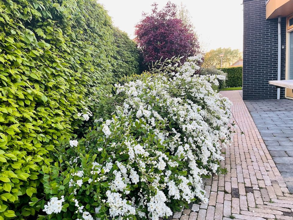 Der große Garten verfügt über zwei Terrassen, von denen eine direkt am Wasser liegt. Der Garten ist von Hainbuchen umgeben, was Ihnen viel Privatsphäre bietet.