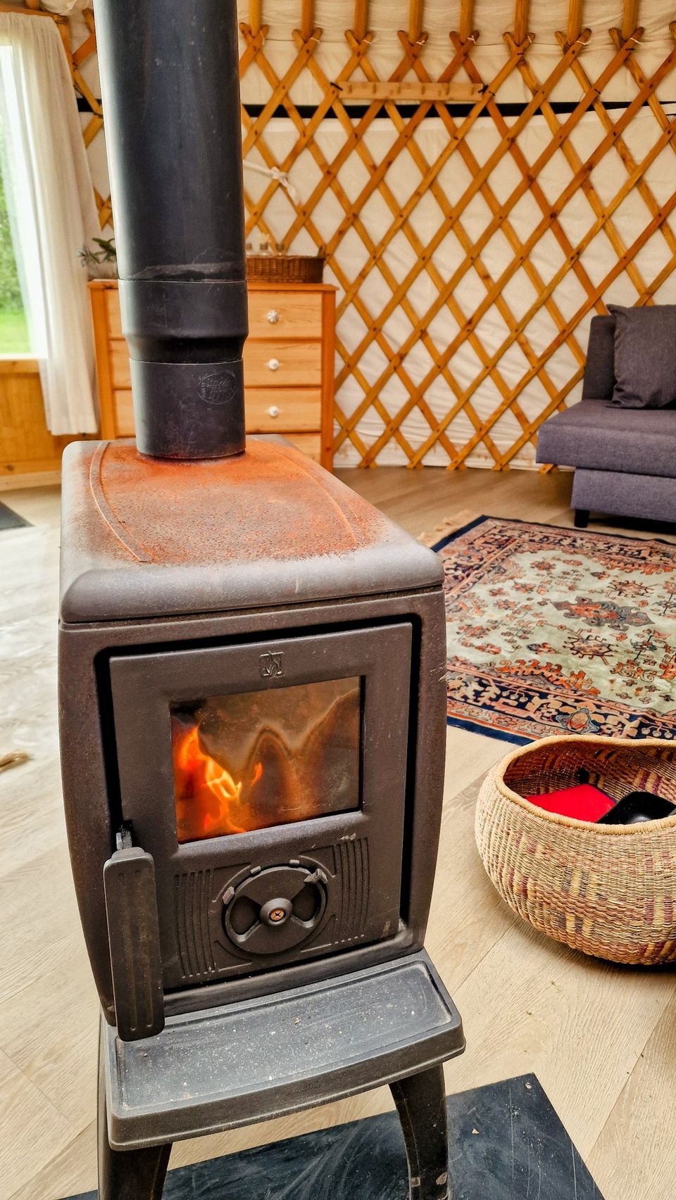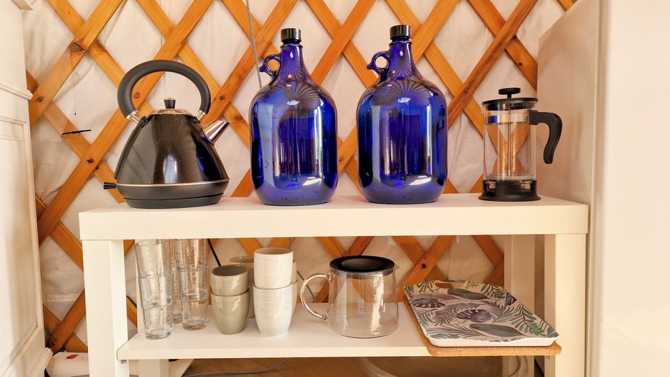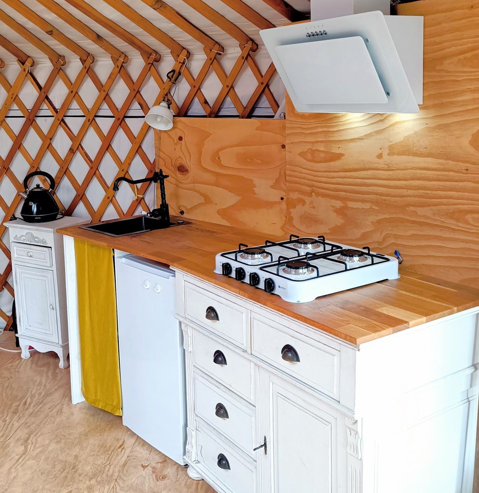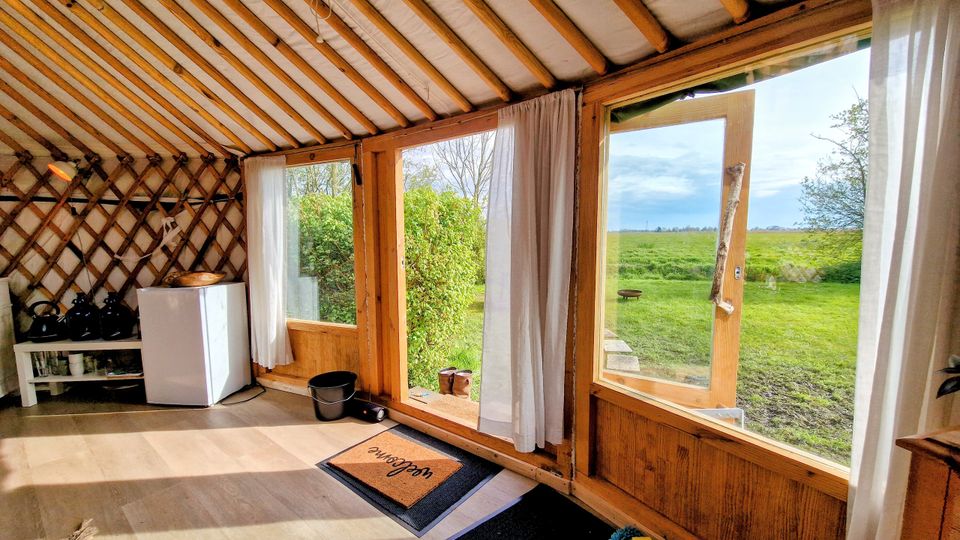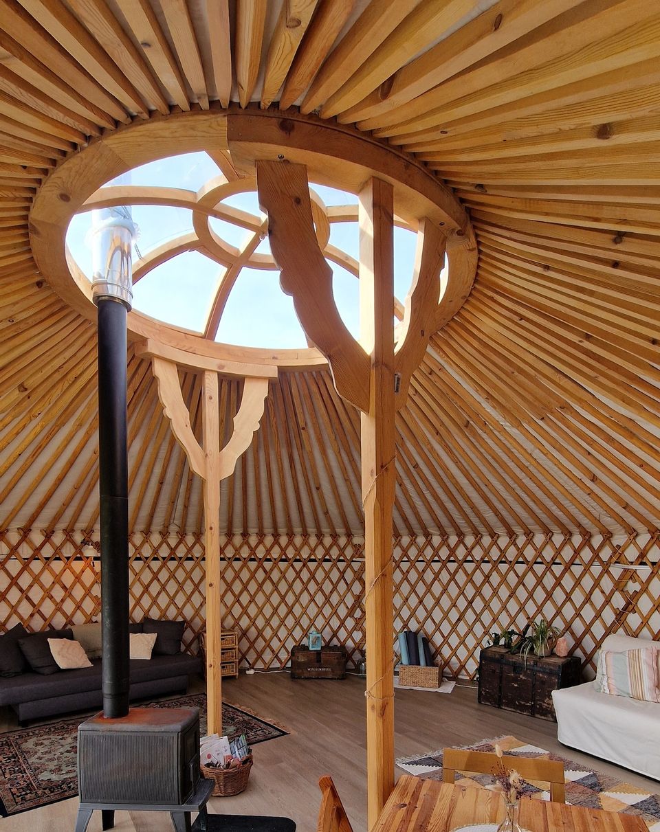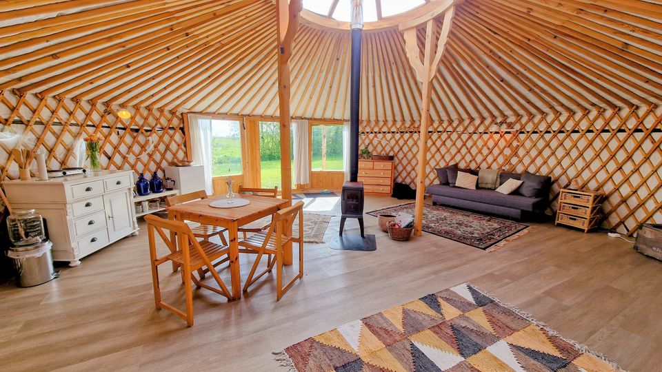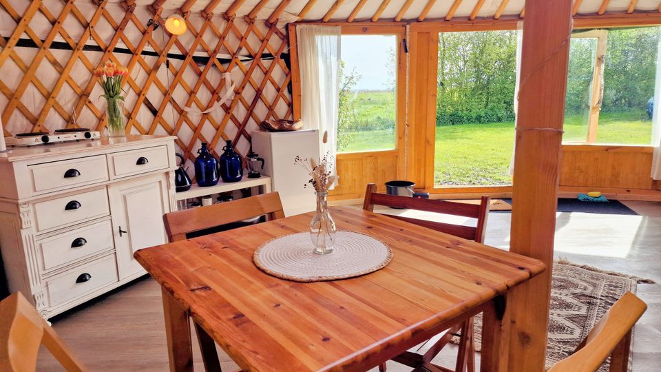 Die große Jurte liegt an einem wunderschönen Platz am Wiesenrand und bietet ein einzigartiges Campingerlebnis. Im Inneren finden Sie zwei geräumige Schlafsofas, einen Esstisch und eine einfache Küchenzeile mit Ein-Flammen-Herd, Kühlschrank und Küchenutensilien. Für die kälteren Tage gibt es einen Holzofen. Wasser erhalten Sie aus dem Wasserhahn in der Nähe der Jurte. Draußen gibt es einen Picknicktisch, an dem Sie in Ruhe die Aussicht genießen und abends in der Feuerstelle ein Feuer anzünden können.