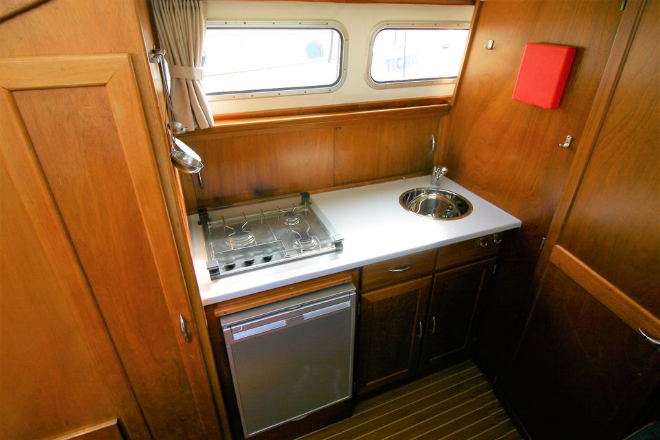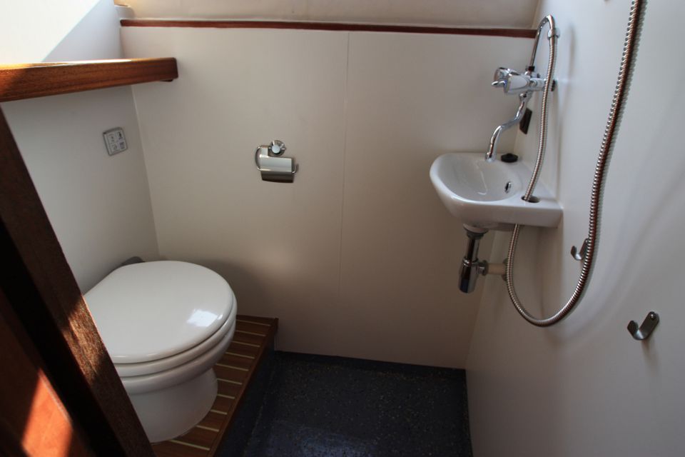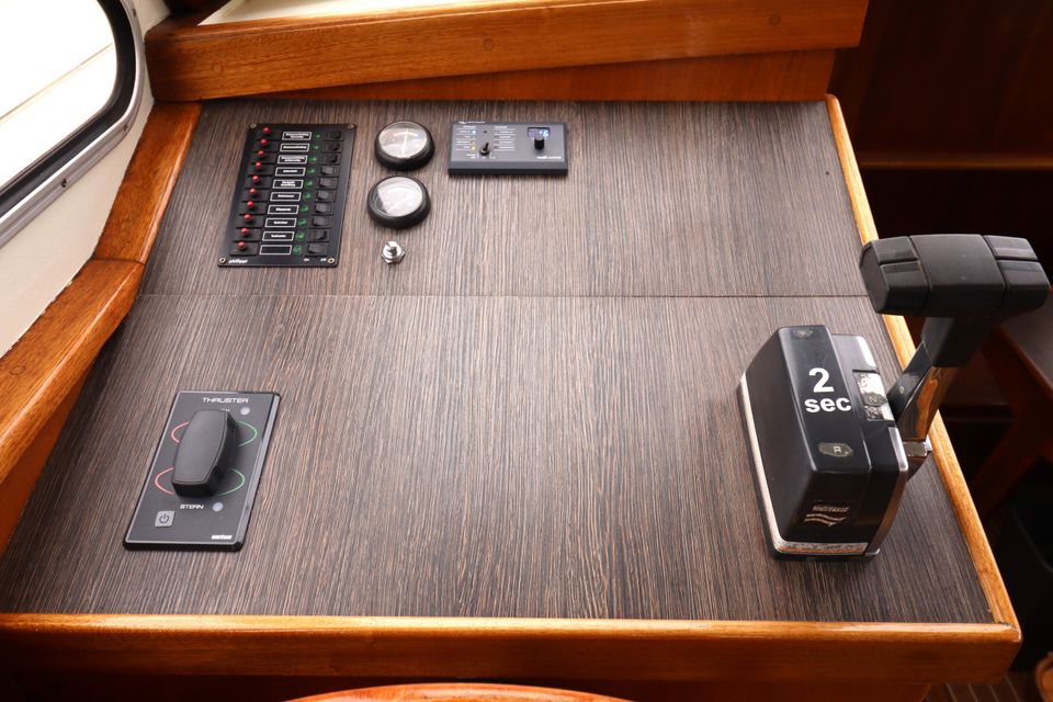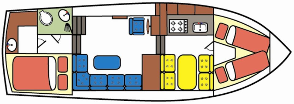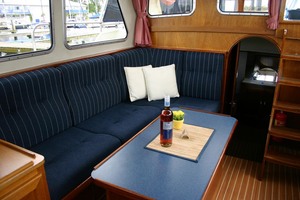 Layout: Im vorderen Bereich befindet sich eine geschlossene Doppelkabine mit Stauraum. Die geräumige Küche ist mit einem 4-Plattenherd, Kühlschrank und einem kompletten Inventar für 6 Personen ausgestattet. Die Dinette kann in eine zusätzliche Doppelkoje umgebaut werden. Der Salon verfügt über eine gemütliche Sitzecke und den Steuerstand. Die Achterkabine verfügt über eine zweite Doppelkabine mit zusätzlichem Waschbecken für mehr Privatsphäre sowie zusätzlichen Stauraum. Das Boot verfügt außerdem über eine Dusche, eine elektrische Toilette und ein Waschbecken.
