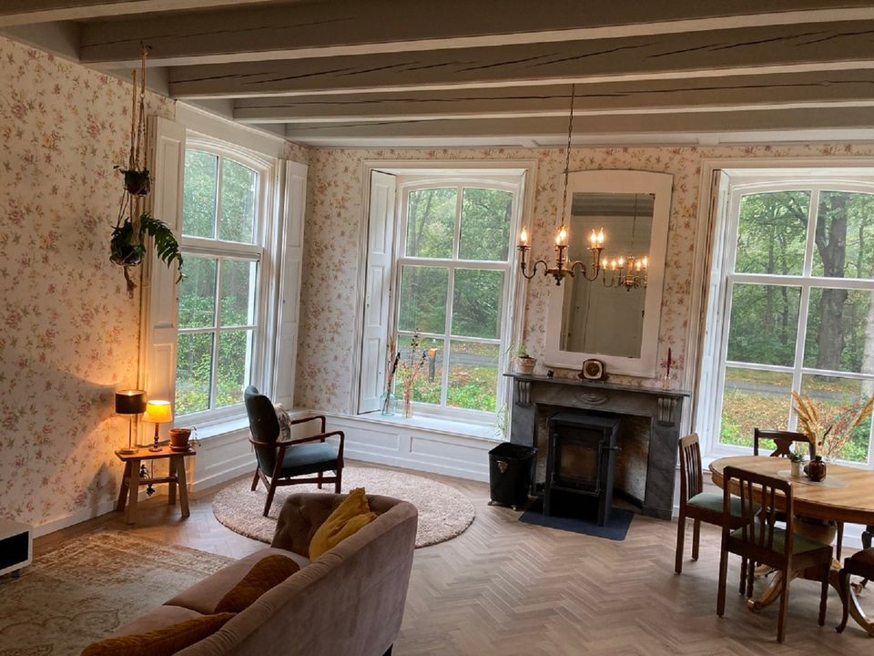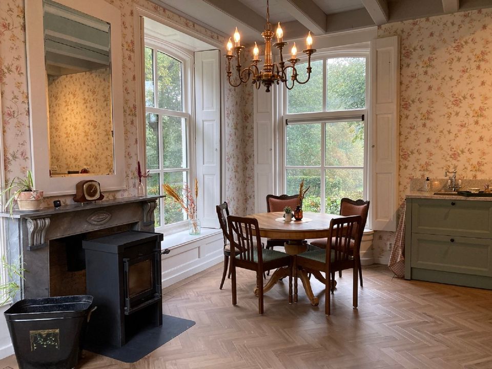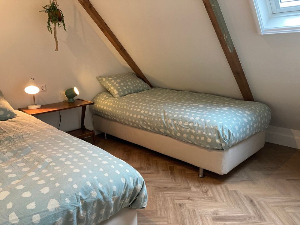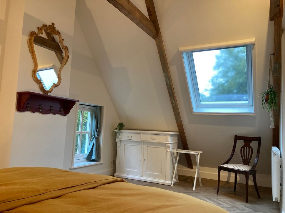 Das Vorderhaus dieses stattlichen Kopf-Hals-Rumpf-Bauernhofes von 1875 kann als B&B oder Ferienwohnung gemietet werden. Das Vorderhaus wurde 2022 renoviert, die ursprünglichen Details wurden erhalten und restauriert. Die schönen Fenster, die authentische Tischlerei und das Kastenbett machen dieses Haus einzigartig. Das Zimmer im Obergeschoss verfügt über eine voll ausgestattete Küche mit Geschirrspüler und Kühlschrank mit Gefrierfach. Im oberen Raum können Sie am runden Tisch speisen, gemütlich um den Kamin herumsitzen und im Fernsehen einen netten Film anschauen. Im ersten Stock befinden sich zwei Schlafzimmer, eine geräumige Diele mit viel Stauraum und ein luxuriöses Badezimmer mit schöner Dusche und Toilette. Draußen gibt es schöne Orte, um die Sonne, die Vögel und die Stille zu genießen. Kaffee und Tee stehen selbstverständlich zur Verfügung.