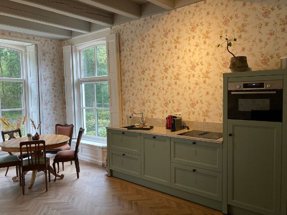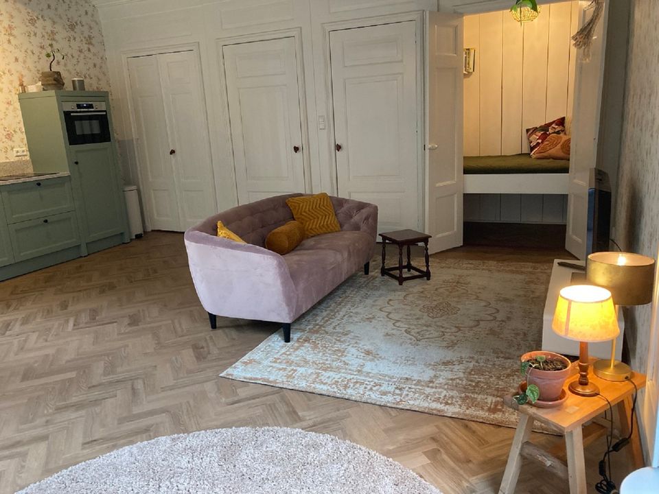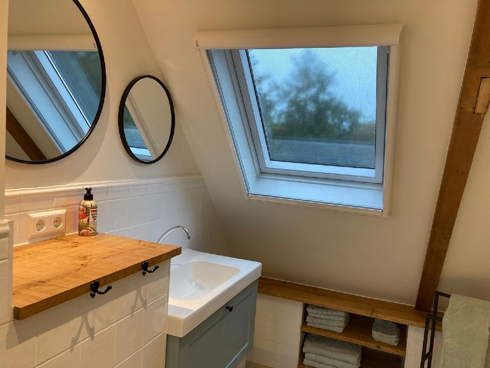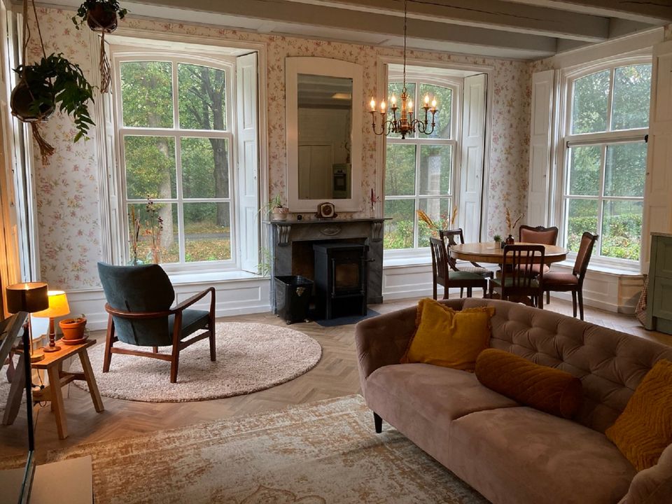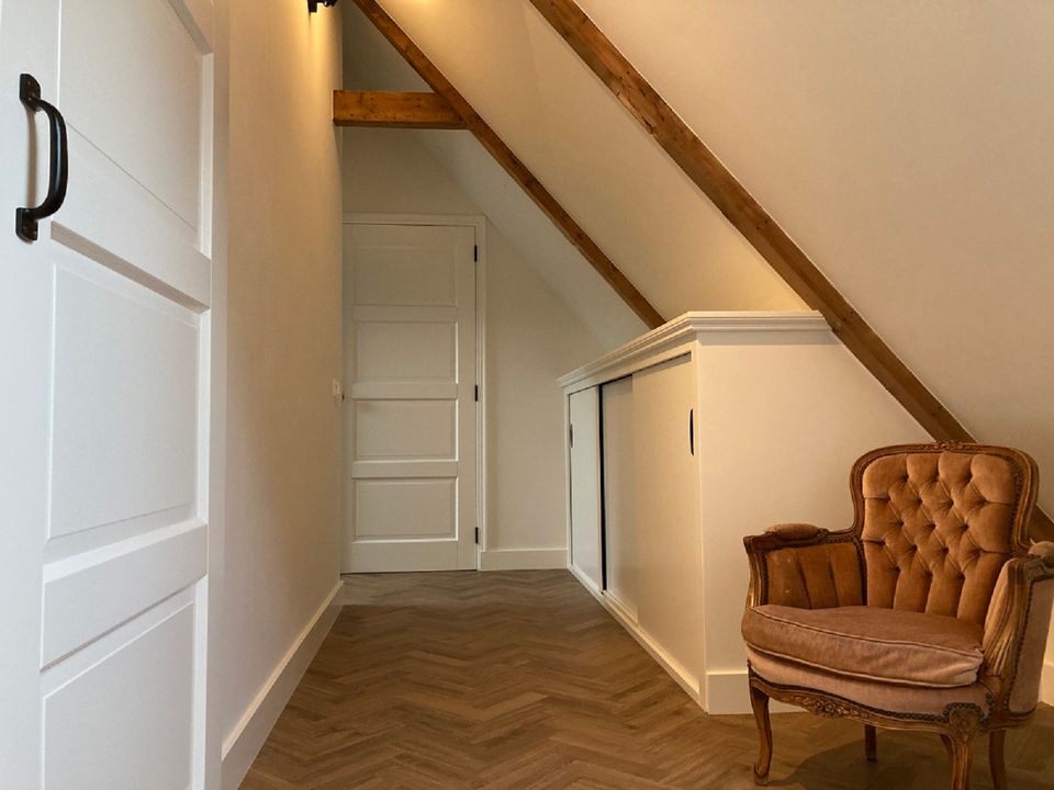 Das Vorderhaus dieses stattlichen Kopf-Hals-Rumpf-Bauernhofes von 1875 kann als B&B oder Ferienwohnung gemietet werden. Das Vorderhaus wurde 2022 renoviert, die ursprünglichen Details wurden erhalten und restauriert. Die schönen Fenster, die authentische Tischlerei und das Kastenbett machen dieses Haus einzigartig. Das Zimmer im Obergeschoss verfügt über eine voll ausgestattete Küche mit Geschirrspüler und Kühlschrank mit Gefrierfach. Im oberen Raum können Sie am runden Tisch speisen, gemütlich um den Kamin herumsitzen und im Fernsehen einen netten Film anschauen. Im ersten Stock befinden sich zwei Schlafzimmer, eine geräumige Diele mit viel Stauraum und ein luxuriöses Badezimmer mit schöner Dusche und Toilette. Draußen gibt es schöne Orte, um die Sonne, die Vögel und die Stille zu genießen. Kaffee und Tee stehen selbstverständlich zur Verfügung.