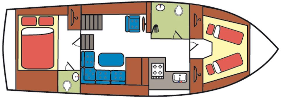 Layout: Im Vorschiff finden Sie eine Dusche mit Waschbecken und eine elektrische Toilette. Im Bug befinden sich zwei geräumige Einzelbetten. Die attraktive Lounge verfügt über eine L-förmige Sitzecke, in der das Sofa problemlos in ein Doppelbett umgewandelt werden kann. Die geräumige Küche ist komplett für 6 Personen ausgestattet, unter anderem mit 4-Flammen-Gasherd, Kühlschrank und Kaffeemaschine. In der Achterkabine können Sie bequem in einem großen Doppelbett schlafen. Außerdem gibt es eine zweite elektrische Toilette mit Waschbecken.