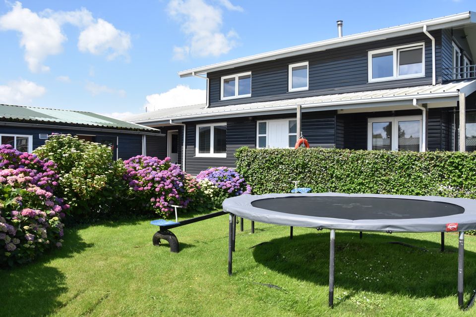 Diese geräumige Gruppenunterkunft befindet sich komplett im Erdgeschoss und besteht aus einem großen Wohnbereich mit Wohnzimmer, Essbereich und Bar. Der große Industriekühlschrank bietet alles, was Sie brauchen, einen großen Gasherd, Backofen und Geschirrspüler. Die Gruppenunterkunft verfügt über 10 Schlafzimmer, die abwechselnd für 2 - 8 Personen geeignet sind. Die Schlafzimmer bestehen aus Etagenbetten und Einzel-Boxspringbetten. Die Sanitäranlagen sind in drei Bereiche mit insgesamt 6 Duschen und 6 Toiletten aufgeteilt. Jedes Schlafzimmer hat ein eigenes Waschbecken. Draußen ist eine geräumige Terrasse mit Garten, Trampolin, Spielgeräten und einem Whirlpool!