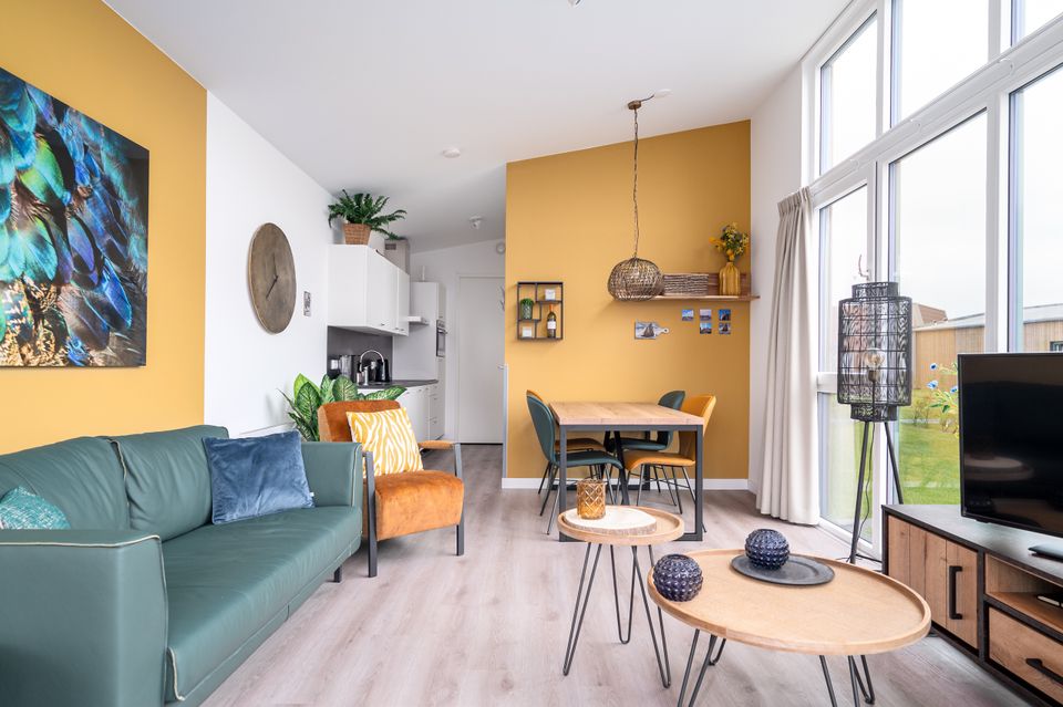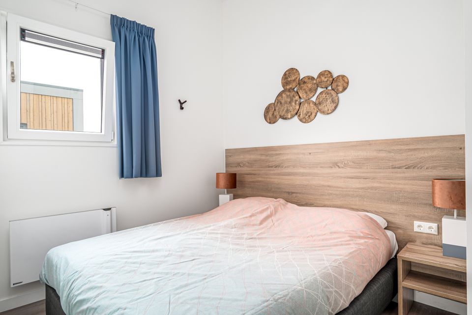 Die Ferienhütte für 2 Personen verfügt über ein Wohnzimmer mit großen Fenstern und eine komplette Küche mit Geschirrspüler. Das Wohnzimmer verfügt über einen separaten Essbereich. Darüber hinaus gibt es 1 Schlafzimmer mit zwei Einzelbetten und ein Badezimmer mit Regendusche, Toilette und Waschbecken. Außerdem verfügt das Haus über eine Sauna.