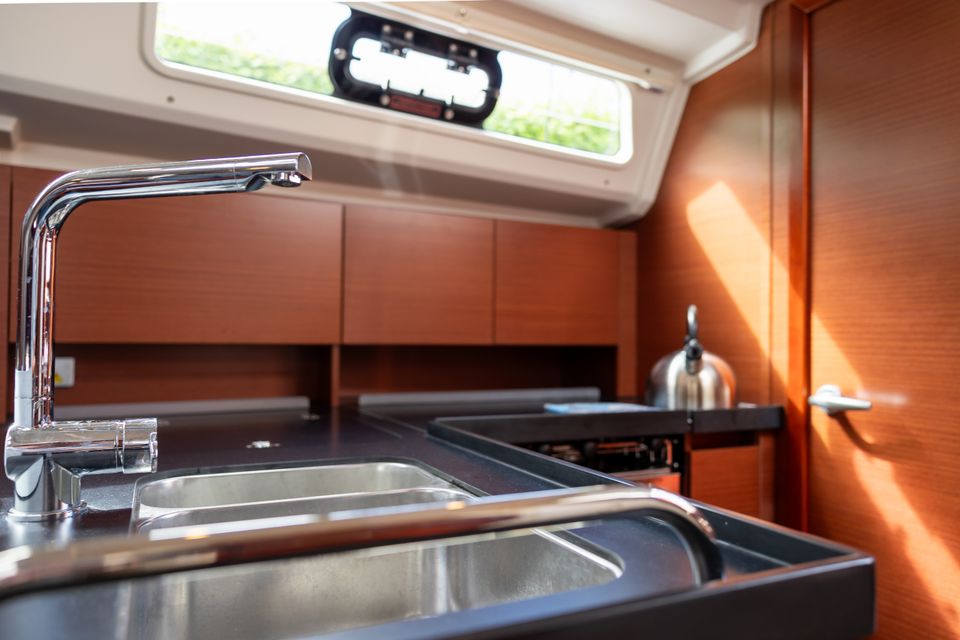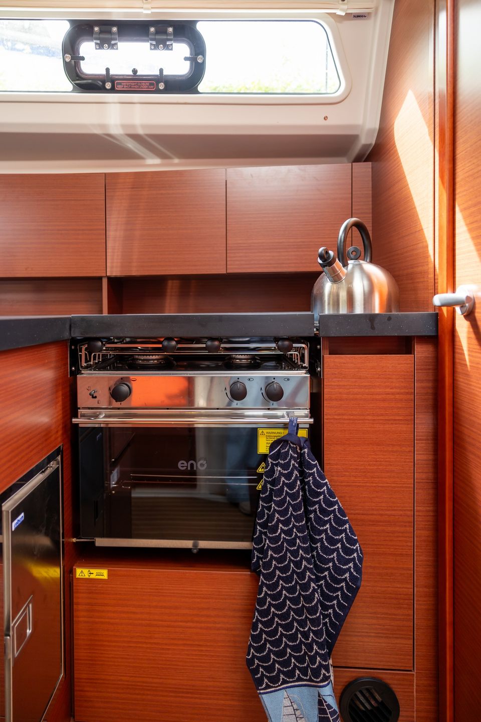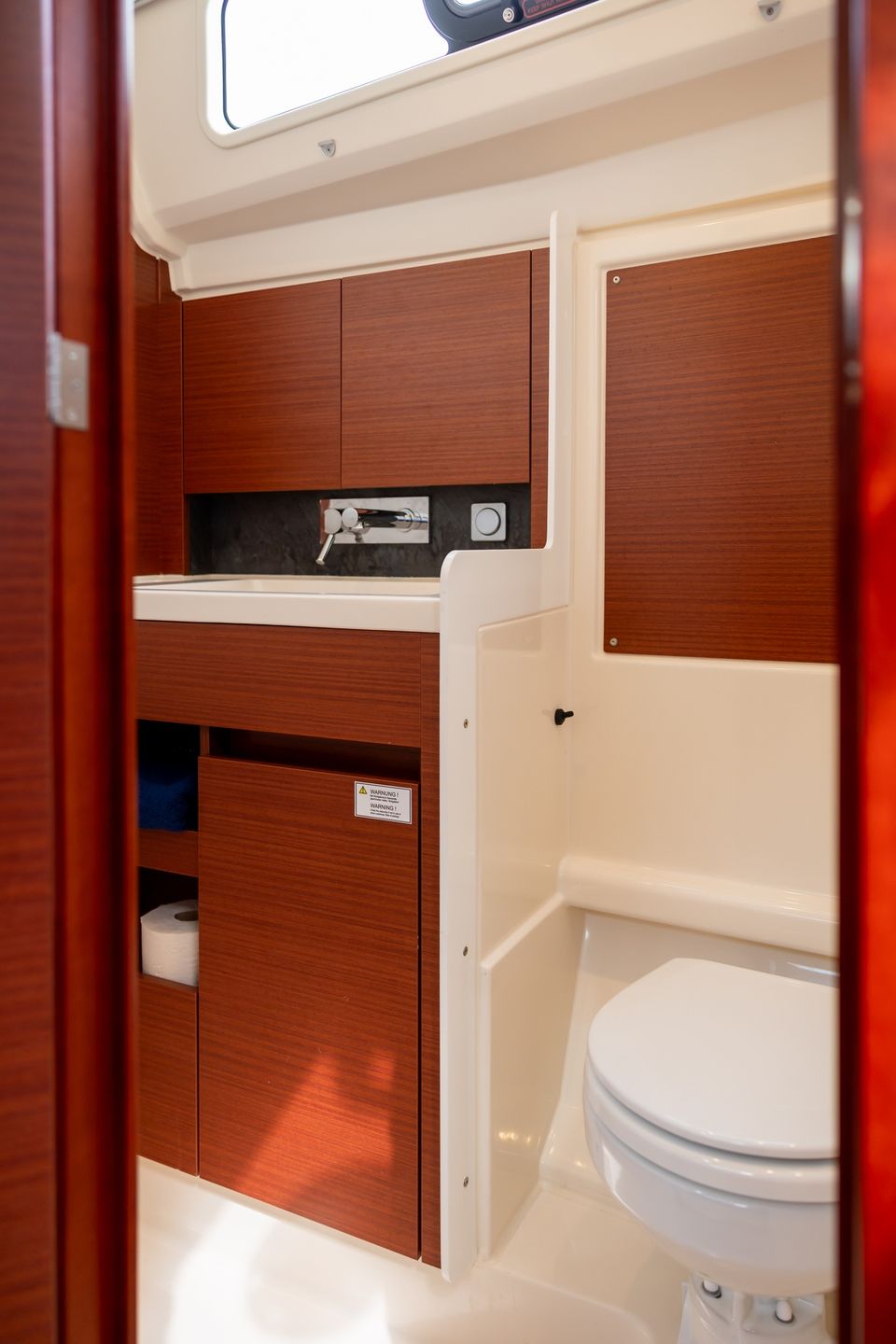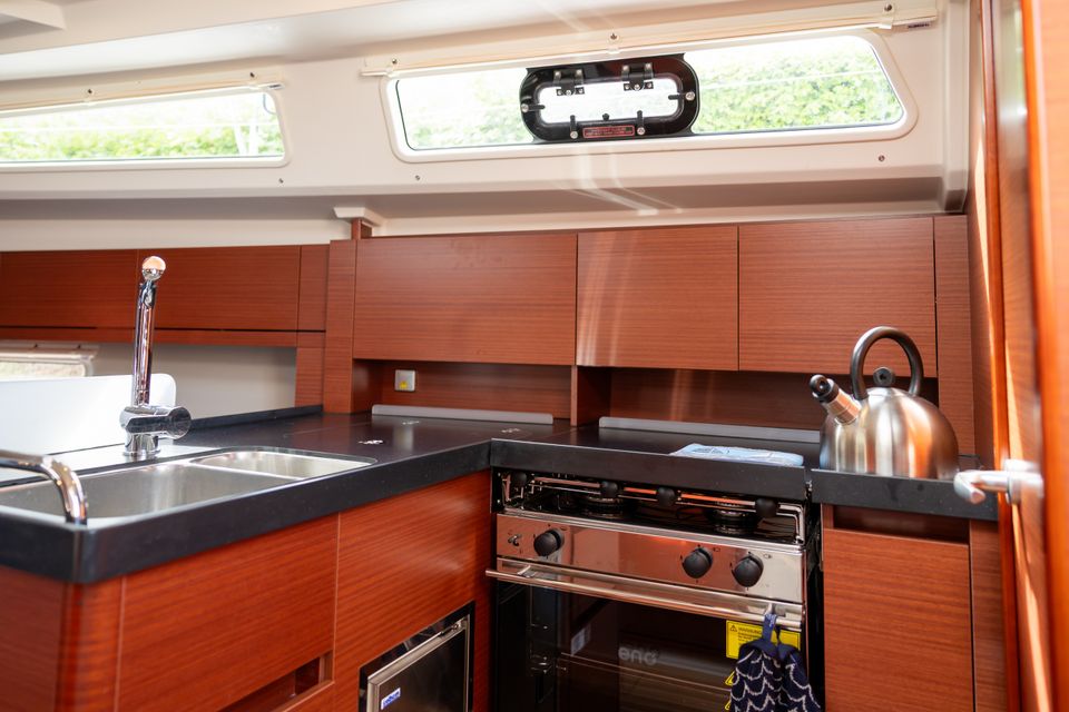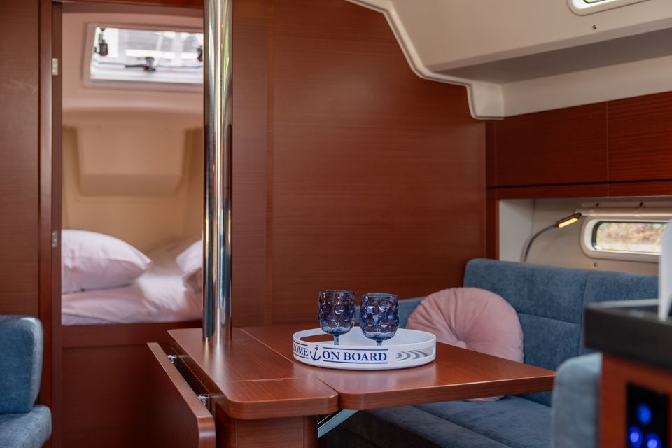 Das geräumige Cockpit mit Tisch und die Badeplattform mit Treppe machen Ihren Aufenthalt an Bord besonders angenehm. Egal ob Sie im Hafen anlegen oder vor Anker gehen, beides ist möglich. Im Inneren finden Sie allen Komfort für einen angenehmen Aufenthalt: einen Zwei-Flammen-Herd, Kühlschrank, Dusche, Boiler, Pumptoilette und Navigationshilfen wie Kartenplotter, UKW-Radio und AIS.