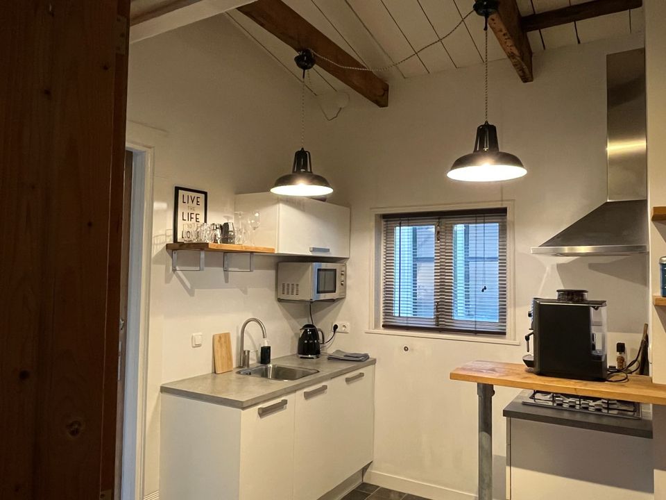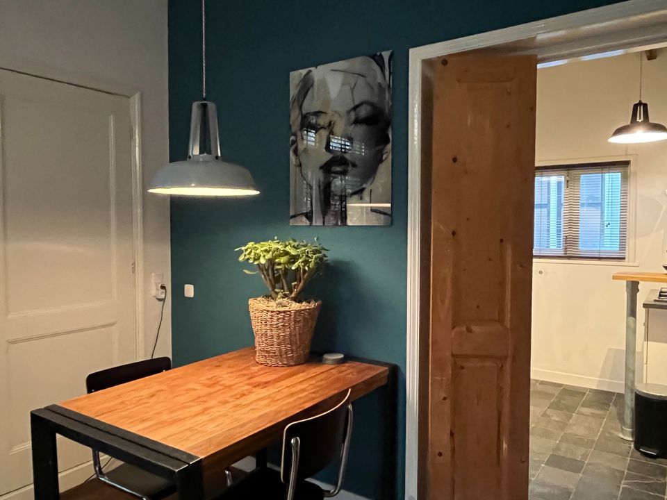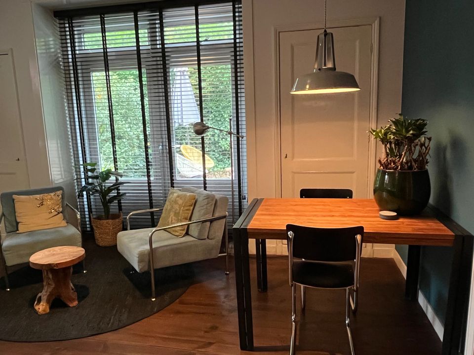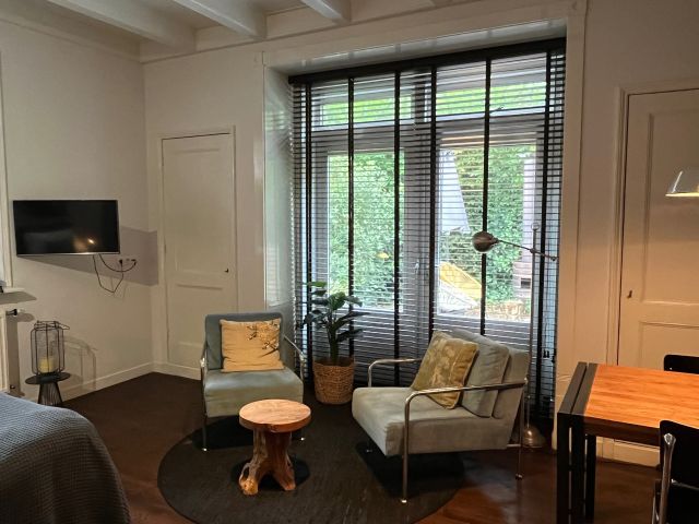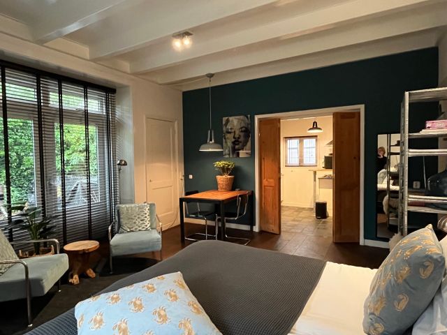 Das Gartenzimmer befindet sich im Erdgeschoss. Der Raum ist durch das Tor zum Stadtgarten zu erreichen. Es hat ein charaktervolles, geräumiges Wohn-/Schlafzimmer mit Terrassentüren und Zugang zu Ihrer eigenen privaten Terrasse mit Lounge-Sofa und Holzofen. Das Zimmer verfügt über ein Badezimmer mit Regendusche, ein separates WC und eine gut ausgestattete Küche mit Kaffeemaschine, Geschirrspüler, Kühlschrank und Mikrowelle. Es gibt auch einen modernen Fernseher mit Netflix und (privatem) WLAN.