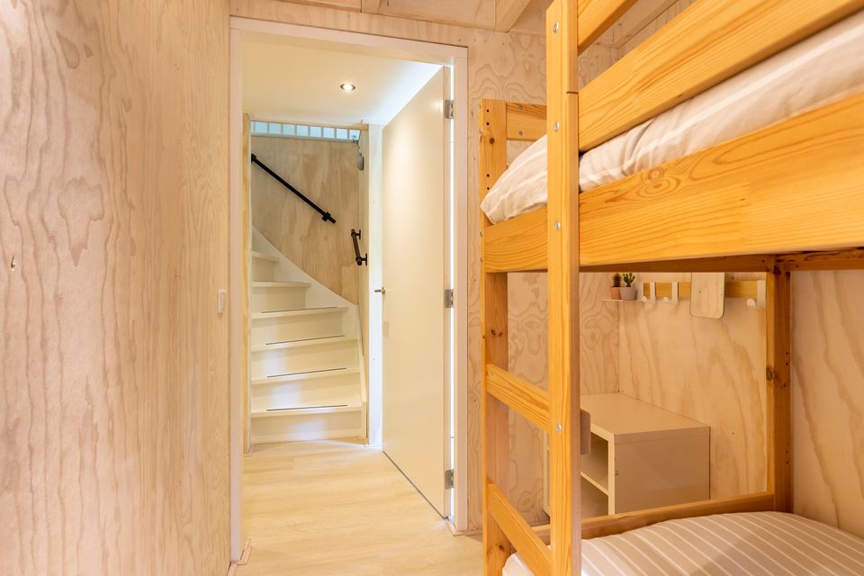Im ersten Stock gibt es ein helles Loft mit Spielecke und Schreibtisch. Für zusätzlichen Komfort sorgen eine Waschmaschine und ein Trockner sowie Holz für den Ofen. Da auch Hochstühle vorhanden sind, ist das Haus ideal für Familien.