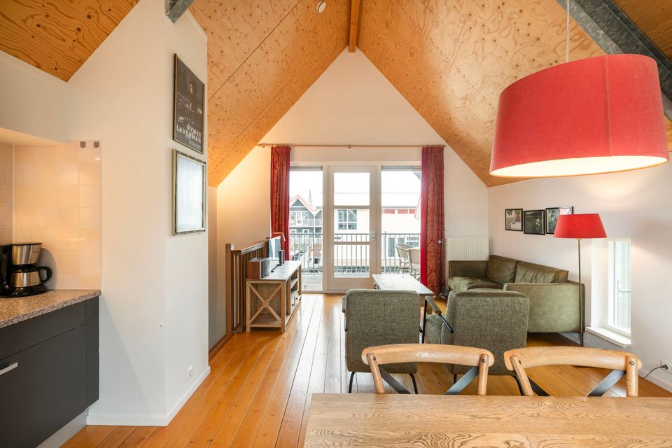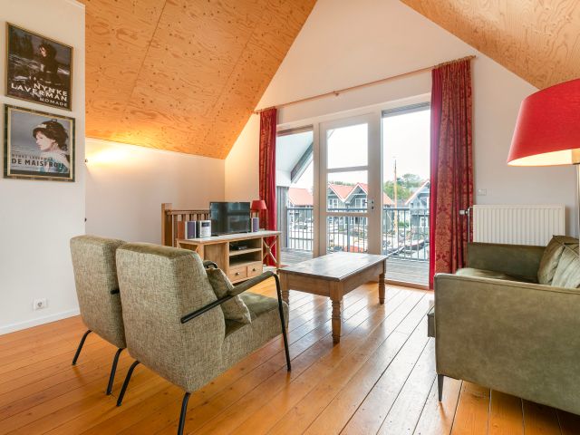 Das Wohnzimmer verfügt über eine Sitzecke und einen Fernseher und grenzt an die offene Küche mit Essbereich. Die Küche ist unter anderem mit einem Kühlschrank mit Gefrierfach, einer Mikrowelle und einer Filterkaffeemaschine ausgestattet. Der Bungalow verfügt über zwei Schlafzimmer mit jeweils zwei Boxspring-Einzelbetten. Das Badezimmer verfügt über eine ebenerdige Dusche und ein Waschbecken. Es gibt eine separate Toilette. Darüber hinaus verfügt der Bungalow über einen Balkon mit Blick auf das Wasser.