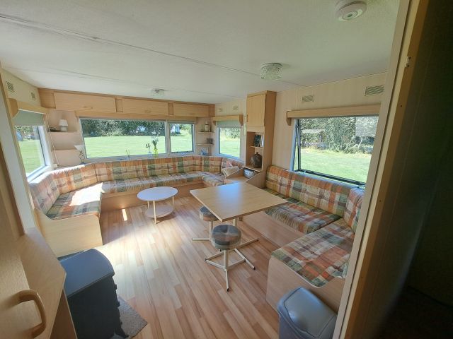 Dieses schöne Mobilheim ist für vier Personen geeignet. Es gibt zwei Schlafzimmer, eines mit einem Doppelbett und eines mit zwei Einzelbetten. Die Betten verfügen über Kissen und eine Bettdecke, Bettwäsche müssen Sie selbst mitbringen. Es gibt auch ein Badezimmer mit Dusche, Toilette und Waschbecken. Das Wohn- und Esszimmer dieses Mobilheims ist geräumig und verfügt über lange Sofas und einen separaten Essbereich. Die Küche ist kompakt, aber komplett und verfügt über einen Gasherd, einen Kühlschrank und eine Filterkaffeemaschine.