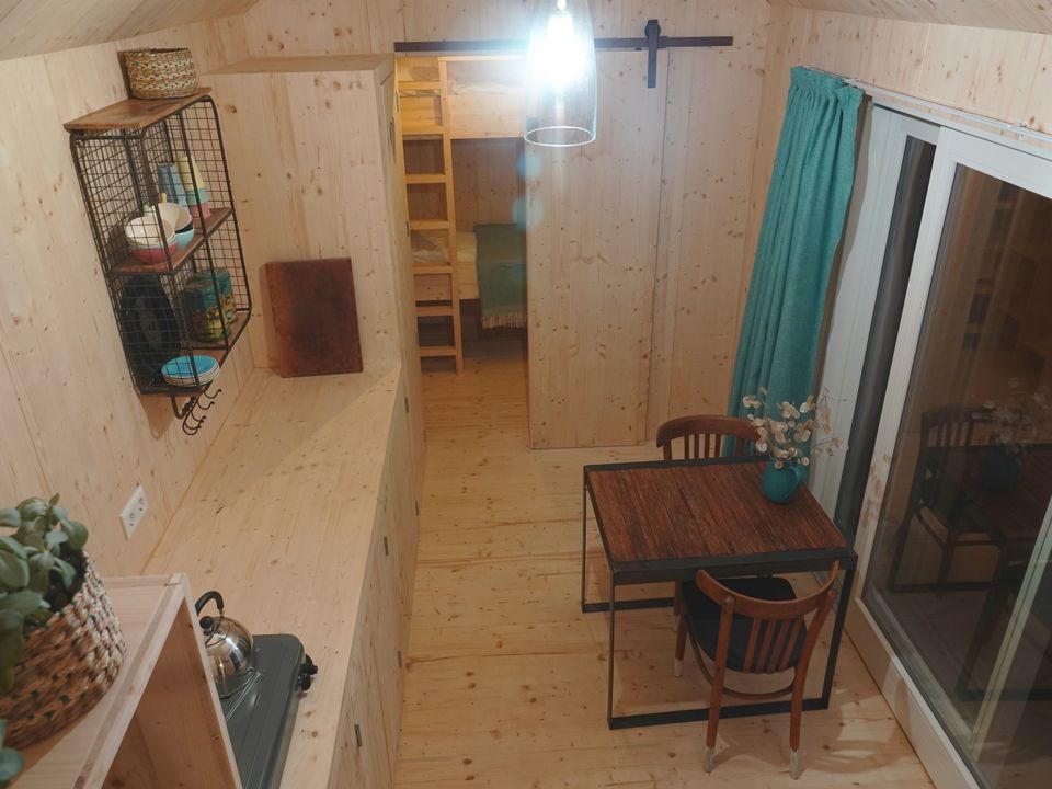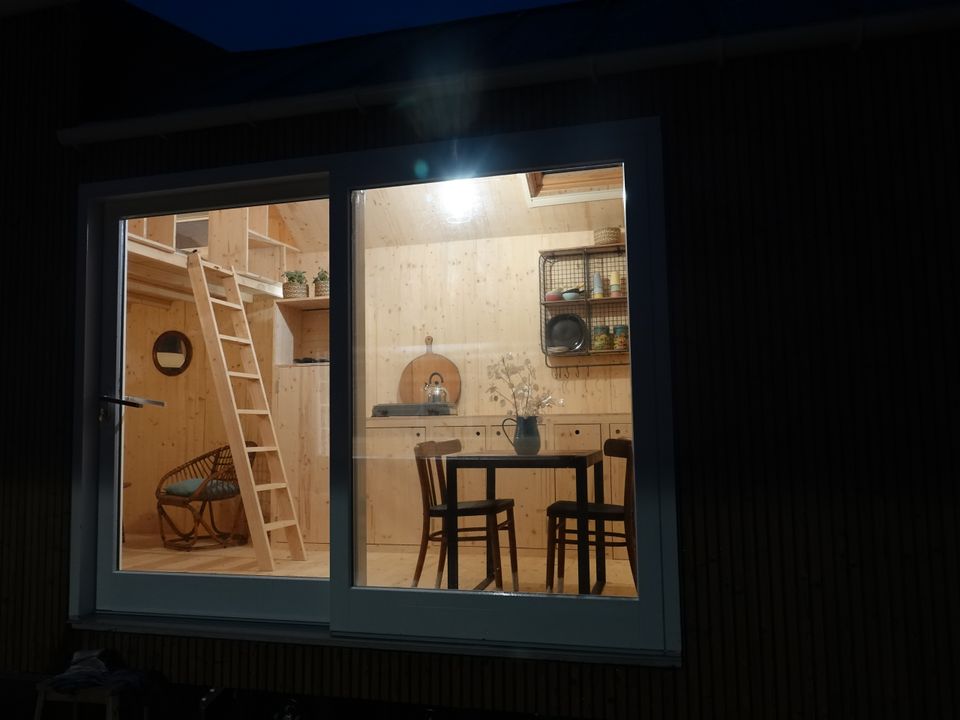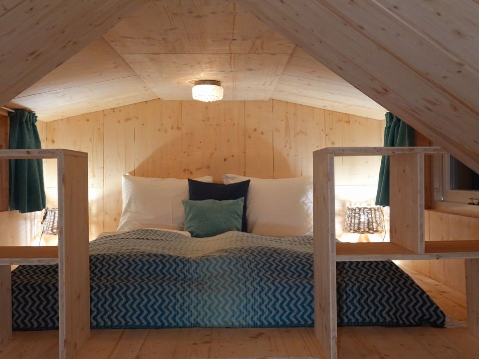 Sie legen Wert auf einen nachhaltigen Urlaub? Dann ist dieses selbstgebaute, biobasierte Tiny House genau das Richtige für Sie! Dieses Cottage bietet Platz für vier Personen und verfügt über ein Doppelbett auf dem Zwischengeschoss und ein Etagenbett in einem separaten Schlafzimmer. Das echte Campinggefühl bleibt dabei erhalten: Dusche und Toilette befinden sich fußläufig im luxuriösen Sanitärgebäude des Campingplatzes, wo Sie sich auch mit einem Kanister an Wasser wenden können. Im Außenbereich können Sie auf der Liegewiese entspannen, wo eine Gartengarnitur für Sie bereit steht. Die Küche ist mit Kühlschrank, Kaffeemaschine, Gaskochfeld und allen notwendigen Töpfen, Pfannen und Besteck für vier Personen ausgestattet. Dank der natürlichen Materialien genießen Sie hier ein gesundes und angenehmes Raumklima.