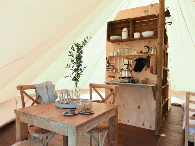 Entspannen Sie sich in diesem komfortabel eingerichteten Rundzelt. Die Zelte verfügen über geräumige Stellplätze und aufgrund der schönen Vegetation echte Privatsphäre und einen Panoramablick auf die grasenden Kühe auf der Wiese. Lage am offenen Wasser, wo Sie die Kanus nutzen können. Das Zelt ist komplett für 4 Personen ausgestattet und bietet alles, was Sie brauchen: BBQ-Grill, Betten, Schlafzimmer und Bank. Die Betten haben wunderbare Matratzen und Bettwäsche. Es gibt ein öffentliches Sanitärgebäude und eine kleine Außenküche mit Trinkwasser und komplettem Geschirr-/Kücheninventar. Draußen gibt es zwei schöne Smûk-Strandstühle und einen Picknicktisch.