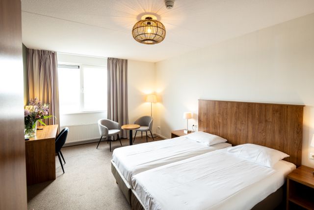 Dieses komfortable, geräumige Doppelzimmer befindet sich auf der Landseite des Hotels. Von den Zimmern blicken Sie auf das Naherholungsgebiet Makkum. Die Zimmer verfügen über zwei bequeme Einzelbetten, einen Schreibtisch und einen Fernseher. Sie verfügen über ein eigenes Badezimmer mit Dusche, WC und Waschbecken mit Haartrockner.