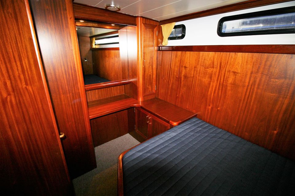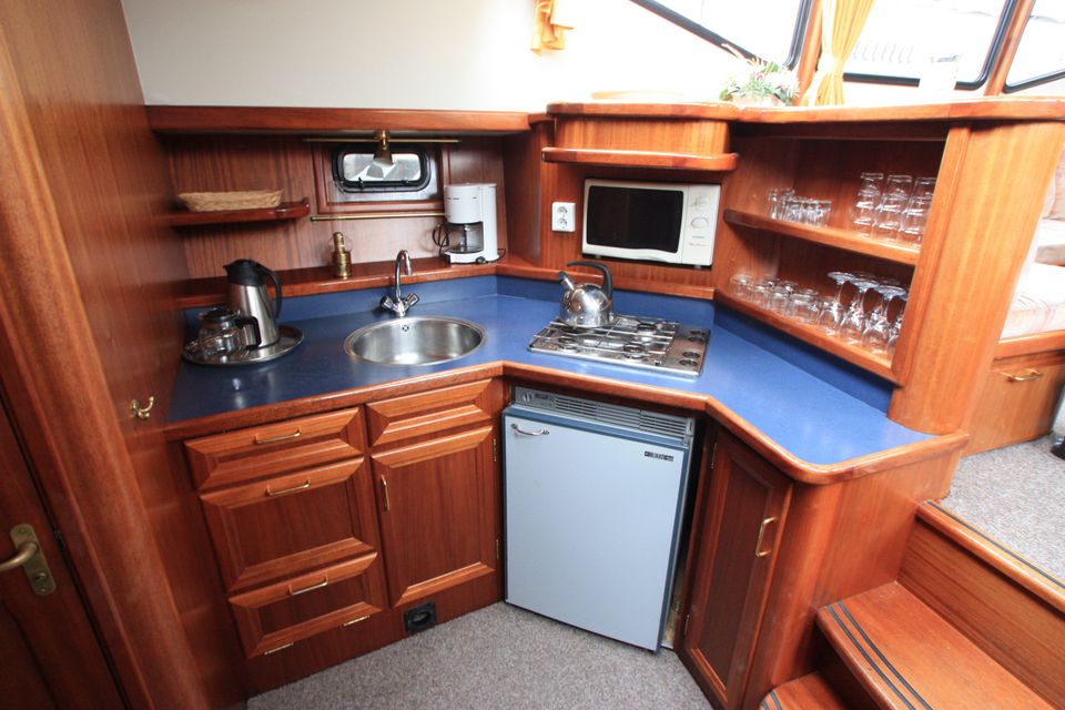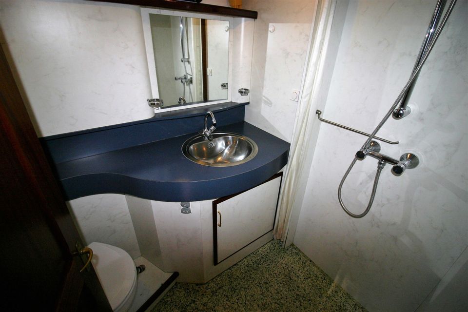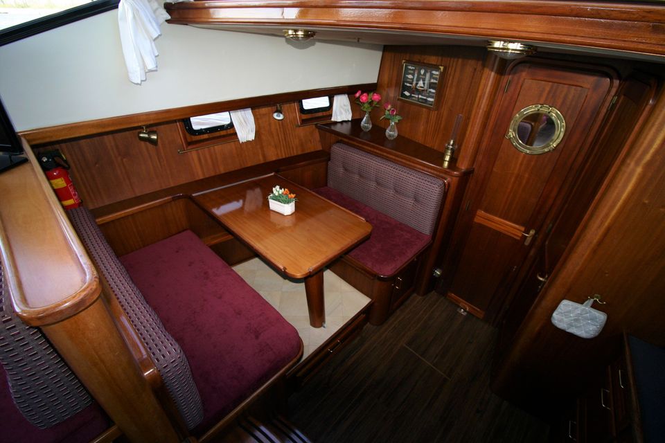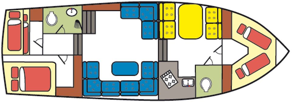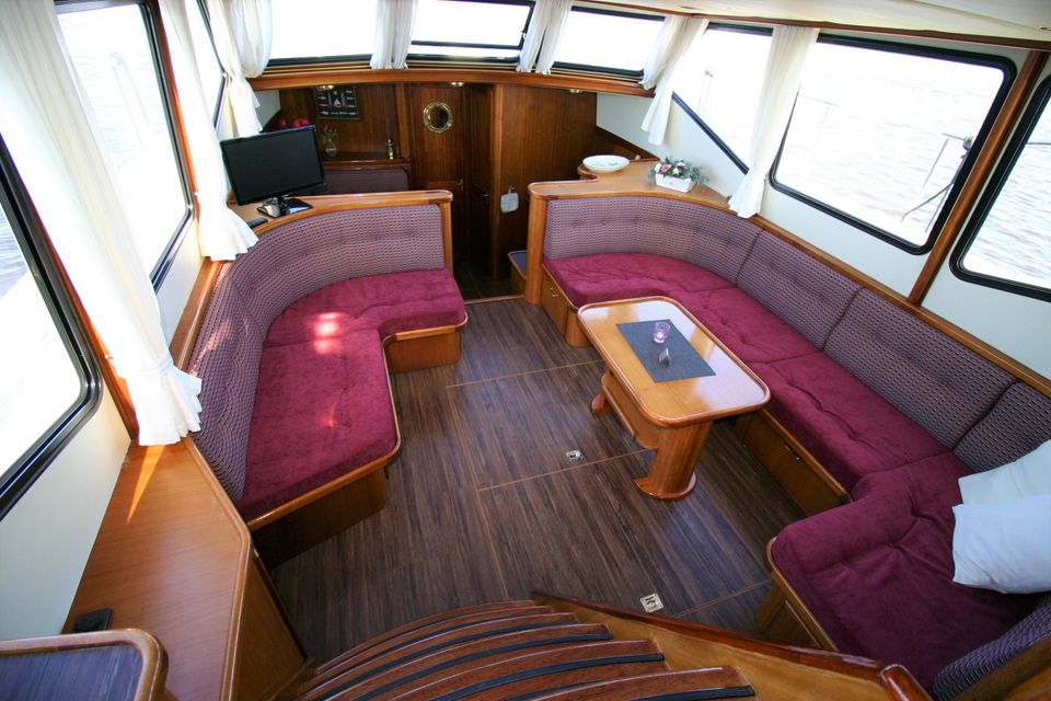 Dieses Boot ist dank des leistungsstarken Motors und des Bug- und Heckstrahlruders einfach zu fahren. Vom großen Sonnendeck aus können Sie das Boot steuern (mit GPS!) und Sie können hier auch bequem mit Ihrer Gruppe sitzen. Strom wird mit dem Solarpanel erzeugt. Am Heck des Bootes befindet sich eine Badeplattform mit Badeleiter und Außendusche. Es gibt drei Schlafkabinen an Bord, zwei davon im Heck und eine in der Vorderkabine. Die Schlafzimmer bestehen aus Doppelbetten oder einem Etagenbett, zusätzlich gibt es ausreichend Stauraum. Das Boot hat zwei Toiletten, ein Waschbecken und eine Dusche. Der großzügige Wohnbereich des Bootes besteht aus einer komfortablen Lounge mit einer großzügigen Sitzecke inklusive Fernseher und Radio. Die Küche befindet sich ebenfalls im Wohnzimmer und ist komplett ausgestattet mit ua Gasherd, Kühlschrank und ausreichend Inventar.