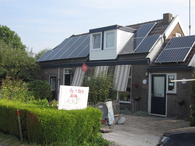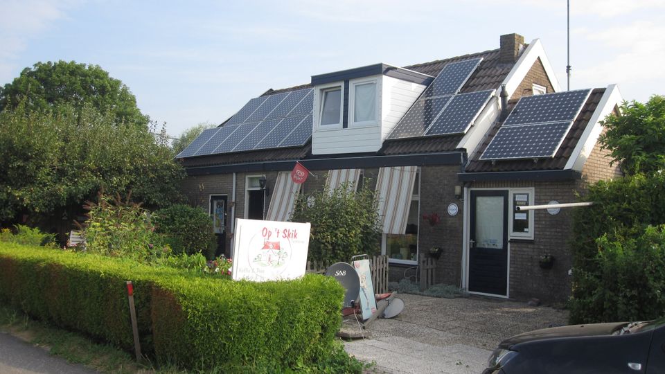 In diesem Haus haben Sie eine eigene Etage, die über eine gute feste Treppe erreichbar ist. So stehen Ihnen zwei Schlafzimmer und eine gemütliche Sitzecke mit Radio und Fernseher zur Verfügung. Eines der Schlafzimmer hat ein Doppelbett, das andere ein Einzelbett. Auf der Etage befinden sich außerdem eine Chemietoilette und ein Waschbecken mit Warm- und Kaltwasser. Duschen können Sie im Erdgeschoss im Gemeinschaftsbad. Der gemütliche Garten bietet mehrere Sitzgelegenheiten, wo Sie bei schönem Wetter, zum Beispiel unter dem Birnbaum, entspannen können. Von den Zimmern im ersten Stock genießen Sie einen schönen Blick auf die umliegenden Felder. Auf der Gartenterrasse verkauft der Eigentümer Kaffee/Tee, Kuchen und Eis.