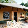 Safarizelt mit eigenen Sanitäranlagen auf einem Campingplatz am Waldrand