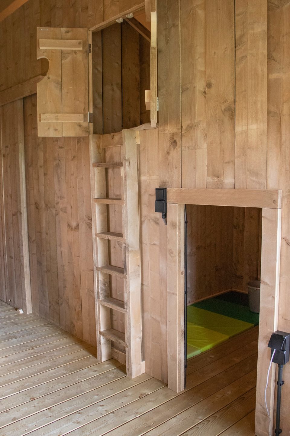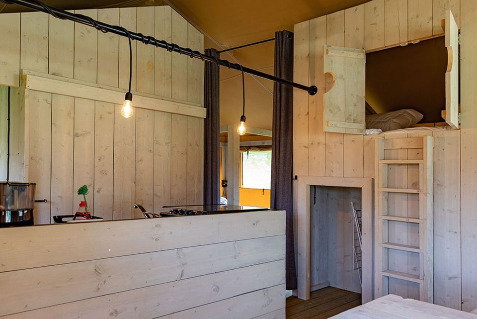 Im Safarizelt befindet sich eine steile Treppe, über die Sie das Boxbett erreichen können. Bettwäsche wird standardmäßig mit Ihrem Aufenthalt geliefert und ein Servicepaket enthält ein Spültuch, einen Mopp, eine Spülbürste, 2x Geschirrspültabs, ein Streichholz, einen Müllbeutel und eine Toilettenpapierrolle.