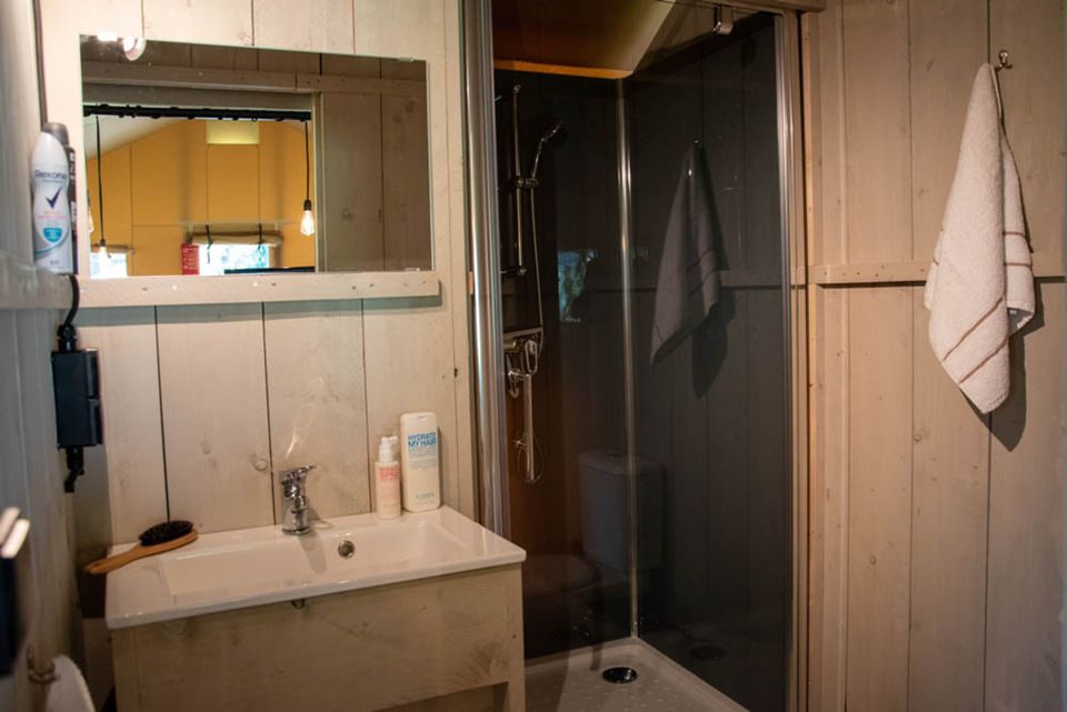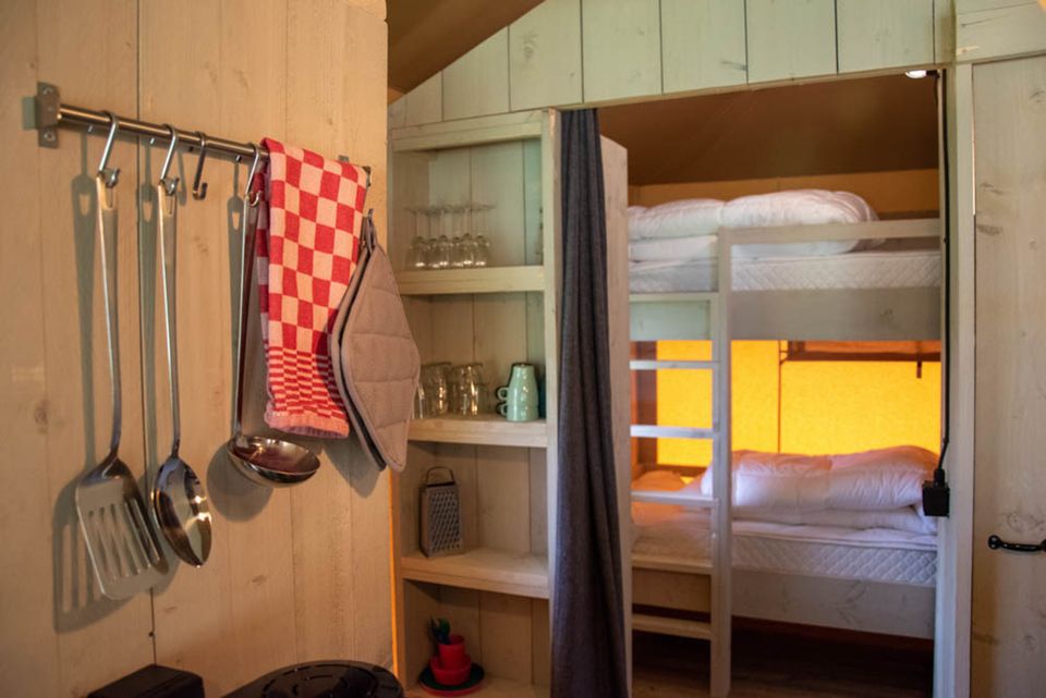 Sie betreten das Safarizelt über eine Holzdeckterrasse mit einem schönen Lounge-Set darauf und sehen sofort, wie viel Platz Sie haben. Im offenen Raum gibt es einen großen Tisch für sechs Personen und eine voll ausgestattete Küche, sogar eine Spülmaschine. Voll ausgestattet! Im Badezimmer finden Sie alles, was Sie brauchen; eine Dusche, ein Waschbecken mit Spiegel und Toilette. Es gibt drei Schlafzimmer im Safarizelt, von denen eines das „Hauptschlafzimmer“ ist und über ein Doppelbett verfügt. Es gibt auch ein Schlafzimmer mit einem Etagenbett, aber der beste Schlafplatz ist vielleicht das Bettkastenbett! Sie steigen eine Treppe hinauf und finden hier einen weiteren Schlafbereich. Wenn es etwas kälter wird, können Sie die Heizung einschalten und es wird schnell warm im Zelt. Genießen Sie die Natur in vollen Zügen, schlafen Sie unter einem Zelttuch und haben Sie trotzdem allen Komfort und einen Hauch von Luxus!