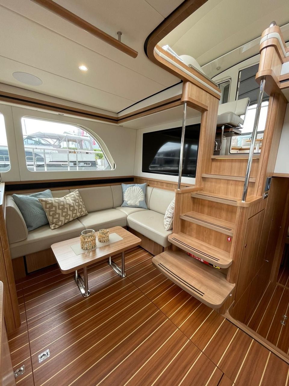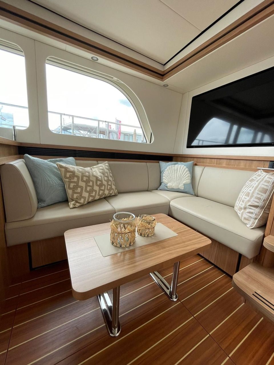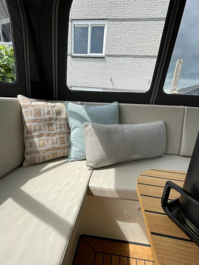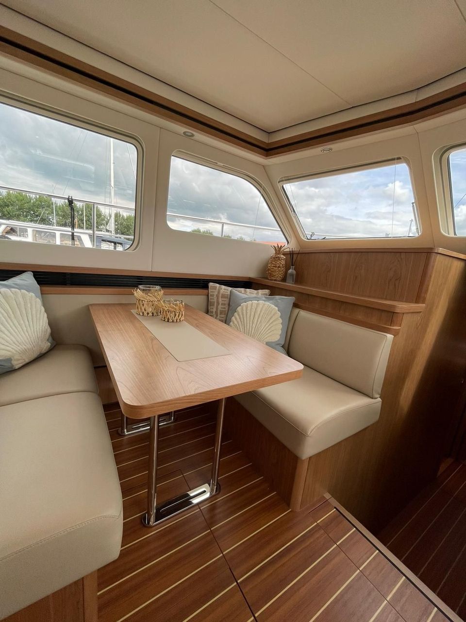 Über der Steuerbank befindet sich das Variotop, das elektrisch betrieben wird. Im Steuerhaus können Sie bequem sitzen und es gibt auch eine kleine Küchenzeile mit einem zusätzlichen Kühlschrank. Dieser Teil des Schiffes ist mit massiven Türen komplett abschließbar und beheizbar. Auf dem Achterdeck befindet sich außerdem ein geräumiges Sofa mit höhenverstellbarem Tisch. Dieser Teil, das Achterdeck, kann auch komplett mit einem Cabrioverdeck verschlossen werden (auf den Fotos nicht abgebildet).