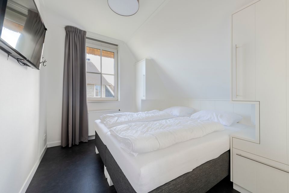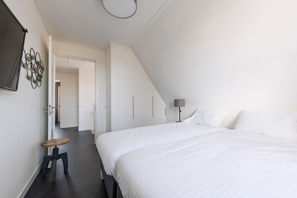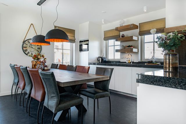 Diese geschmackvoll eingerichtete Villa am Wasser verfügt über ein geräumiges Wohnzimmer mit einem bequemen Sitzbereich. Vom Wohnzimmer mit Schiebetür gelangen Sie auf die Deckterrasse mit herrlichem Blick über das Wasser. Die geräumige Küche ist komplett ausgestattet mit einem langen Esstisch für die gesamte Gruppe. Im Erdgeschoss gibt es auch ein Schlafzimmer mit zwei Einzelbetten und ein Badezimmer mit einer geräumigen finnischen Sauna. Über die Treppe im Flur gelangen Sie in den ersten Stock. Hier sind drei Schlafzimmer mit Boxspring-Einzelbetten und einem Boxspring-Doppelbett. Jedes Zimmer verfügt über einen Smart-TV und viel Stauraum. Es gibt auch drei Badezimmer, von denen eines eine Badewanne und eine separate Toilette hat. Für zusätzlichen Komfort gibt es eine Waschküche mit Waschmaschine, Wäschetrockner und extra Kühlschrank.