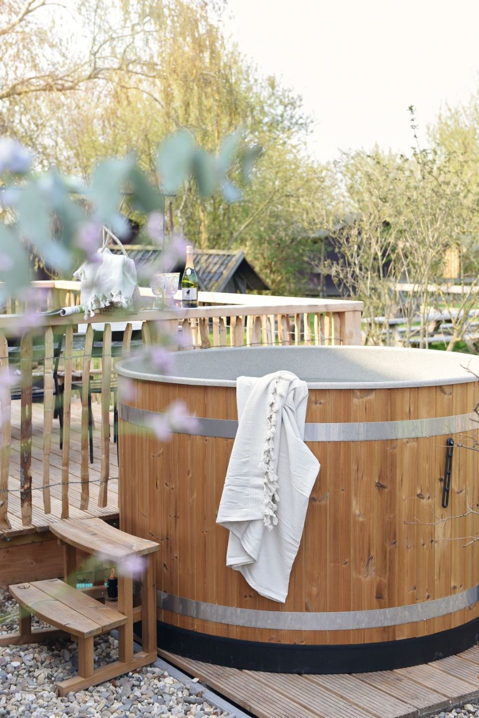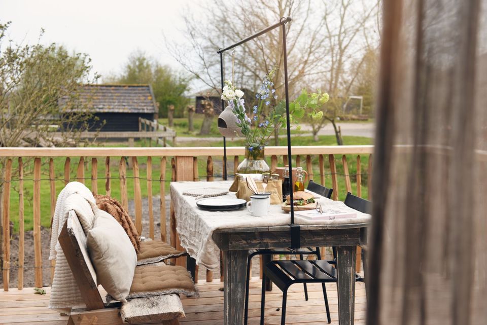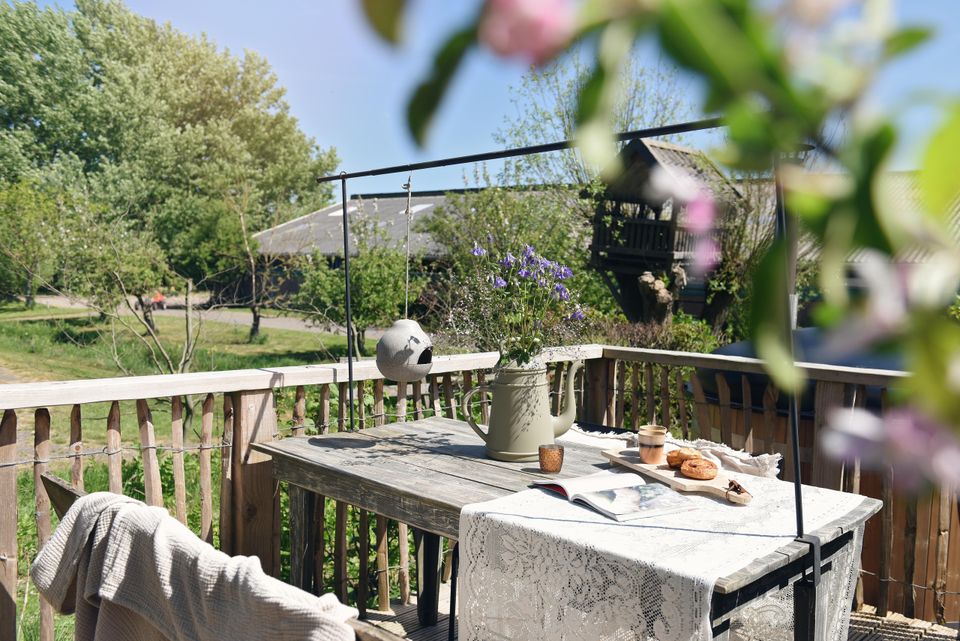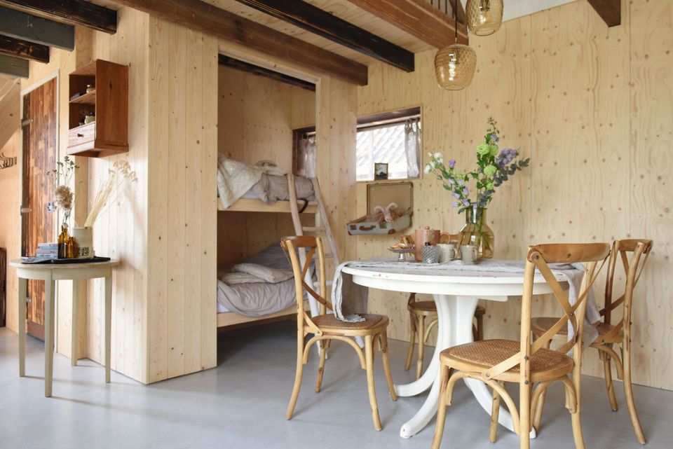 Sie können den Whirlpool nutzen. Es gibt einen Elektrobootverleih und die Kinder werden auf dem Klettergerüst jede Menge Spaß haben. Auf der Wiese gibt es Ziegen, Hühner für frische Eier sowie Kühe und Pferde und im hauseigenen Hofladen können Sie frische Produkte kaufen. In der Bauernscheune finden Sie ein gemütliches Wohnzimmer. Wer hätte gedacht, dass Heuballen so stilvoll sein können? Die sanften Glühbirnen hängen verspielt im Raum. Die Bauerntische eignen sich perfekt für einen Abend mit Gourmetessen oder einer Partie Rummikub. Das Wohnzimmer ist ein Ort des Zusammenseins, aber auch der Rückzug und der Ruhe, die der Altbau ausstrahlt. Manchmal trinken sie eine Tasse Kaffee und Kinder spielen in der Kinderküche. Zu anderen Zeiten ist es ruhig und Sie können einen entspannten Nachmittag in einem der Vintage-Stühle verbringen.
