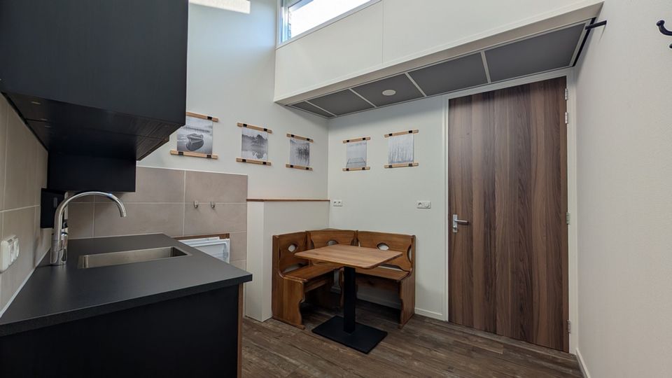 Der Schlafbereich ist mit zwei bequemen Kingsize-Hotelbetten, viel Stauraum, Kleiderbügeln und einem Sessel ausgestattet. Der 42-Zoll-Digitalfernseher bietet ein Standardprogramm, und Sie können Ihren eigenen Laptop, Ihr Telefon oder Ihr Tablet problemlos über den HDMI-USB-C-Anschluss anschließen. Das Zimmer verfügt über ein geräumiges, abschließbares Badezimmer mit Frei-/Besetzt-Schloss, ausgestattet mit Dusche und WC. Ein Spiegelschrank mit Toilettenartikeln und ein Haartrockner sind ebenfalls vorhanden. Die Duschkabine verfügt über eine komfortable Regendusche für einen entspannten Start in den Tag. Jedes Zimmer verfügt außerdem über eine Küchenzeile mit Kühlschrank, Stauraum, Spüle und Kombi-Mikrowelle. Die runde Sitzecke kann als Arbeitsbereich oder für eine einfache Mahlzeit genutzt werden.