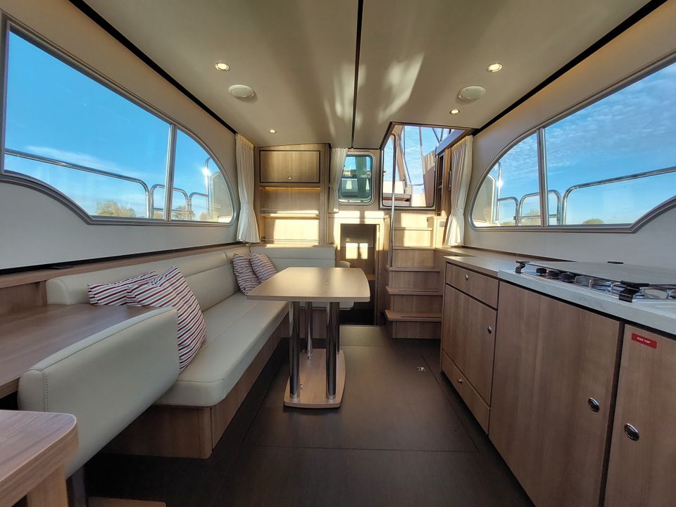 Eine ideale Yacht zum Segeln auf den friesischen Seen. Mit dem Steuerstand auf dem Oberdeck können Sie unter freiem Himmel segeln, das verstellbare Cabrioverdeck macht das Segeln zu jeder Jahreszeit zu einem fantastischen Erlebnis! Die Linssen Grand Sturdy verfügt über ein geräumiges Oberdeck mit einem sehr umfangreichen Steuerungs- und Navigationssystem einschließlich Bug- und Heckstrahlruder. Und ist zudem beheizt, so dass es auch bei weniger schönem Wetter angenehm ist, an Bord und beim Segeln zu bleiben. Es gibt einen stilvollen Salon mit viel (Tages-)Licht und einer schönen hellen Farbgebung. Es gibt zwei geräumige Schlafzimmer mit wunderbaren Betten und extra dicken Matratzen sowie eigenen Sanitäranlagen. Dieses luxuriöse und komfortable Schiff für vier Erwachsene verfügt über perfekte Segeleigenschaften und ist mit vielen Optionen ausgestattet! Das Schiff verfügt über ein Solarpanel, das die Batterien während der Sonnenstunden auflädt. Das Schiff verfügt sowohl über einen 12-Volt- als auch einen 220-Volt-Anschluss, sodass Sie unterwegs immer Strom haben. Schließen Sie das Landstromkabel an, wenn Sie in einem der vielen Häfen in Friesland und den Niederlanden anlegen. Ein komplett integriertes Audiosystem und ein wunderschön versteckter Fernseher mit Digitenne in HD-Qualität sind selbstverständlich an Bord dieser fantastischen Yacht. Entlang der Gangways können Sie problemlos auf beide Seiten des Schiffes oder auf die Badeplattform steigen. Auf der Badeplattform steht ein Bunker mit unter anderem der Gasflasche (sicher an Bord) und eine Badeleiter aus Edelstahl zur Verfügung. Auf der Badeplattform gibt es außerdem eine zweite Dusche mit Warm- und Kaltwasser. Dieses Schiff verfügt über zusätzliche Griffe, um über die Badeplattform sicher auf das Achterdeck zu gelangen.