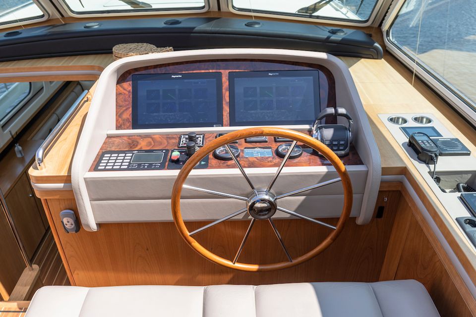 Im Steuerhaus ist das Armaturenbrett mit allen erdenklichen Navigationstools ausgestattet und über der Steuerbank befindet sich das Variotop, das elektrisch betrieben wird. Im Steuerhaus gibt es ausreichend Sitzgelegenheiten und es gibt auch eine kleine Küchenzeile mit einem zusätzlichen Kühlschrank. Dieser Teil des Schiffes ist mit massiven Türen komplett abschließbar und beheizbar. Darüber hinaus gibt es auf dem Achterdeck ein geräumiges Sofa mit höhenverstellbarem Tisch, das sich leicht in ein Lounge-Bett umwandeln lässt. Dieser Teil, das Achterdeck, kann auch mit einem Cabrioverdeck komplett geschlossen werden (auf den Fotos nicht abgebildet). . Die Badeplattform wurde verlängert und ist versenkbar, sodass das Schwimmen noch mehr Spaß macht!