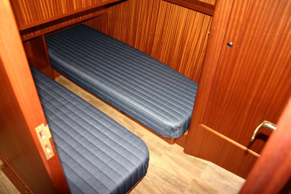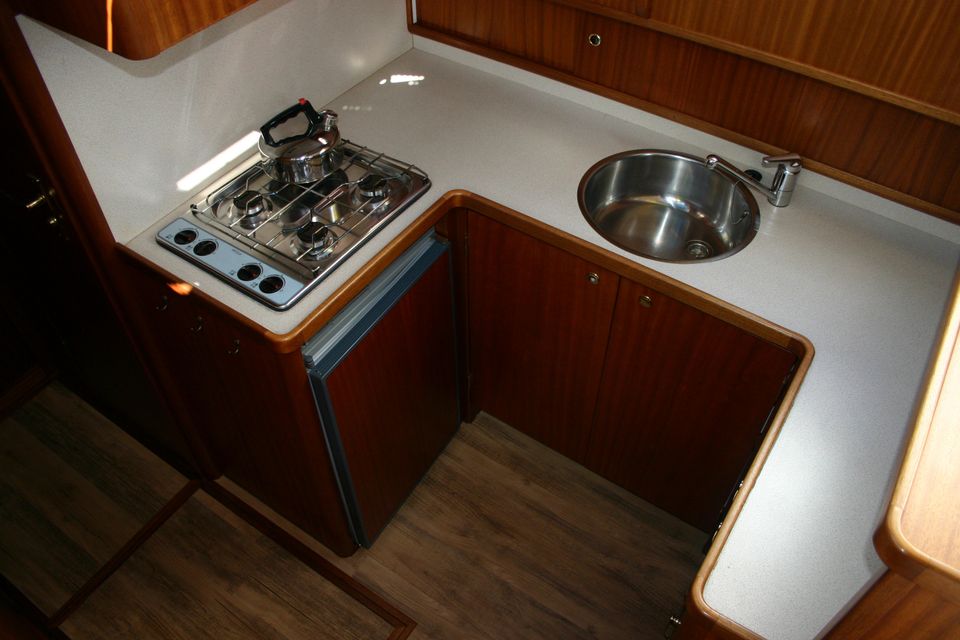 Layout: Im Vorschiff finden Sie zwei geräumige Einzelbetten und ein Badezimmer mit Waschbecken und elektrischer Toilette. Gegenüber der Küche befindet sich ein zusätzliches Schlafzimmer mit zwei Einzelbetten. Die Küche ist komplett für 6 Personen ausgestattet und verfügt über einen 4-Flammen-Gasherd, Kühlschrank und Kaffeemaschine. Die Lounge ist geschmackvoll mit einer L-förmigen Sitzecke mit Lederkissen und zwei separaten Schalensitzen eingerichtet. Die geräumige Achterkabine verfügt über ein großes Doppelbett, eine zweite elektrische Toilette, ein Waschbecken und eine separate Duschkabine. Auch hier ist ausreichend Stauraum vorhanden.