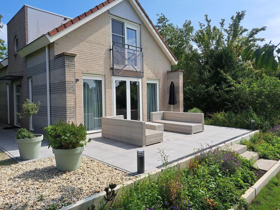 Der Bungalow verfügt über einen sehr großen Garten mit Terrasse. Das Wohnzimmer verfügt über eine schöne Sitzecke mit zwei bequemen Sofas und einem großen Fernseher. Hier können Sie lesen, entspannen oder Ihre Lieblingsserie schauen. Vom Wohnzimmer aus haben Sie durch zwei Terrassentüren direkten Zugang zur Außenterrasse. Die offene Küche ist mit einem Induktionskochfeld, einem Geschirrspüler, einer Kombi-Mikrowelle, einer Senseo-Kaffeemaschine, einem Wasserkocher, einem Toaster und einer Kühl-/Gefrierkombination ausgestattet. Im Dachgeschoss befinden sich drei Schlafzimmer, die alle mit bequemen Boxspringbetten ausgestattet sind. Das Badezimmer verfügt über eine Badewanne, eine Dusche und eine zweite Toilette.