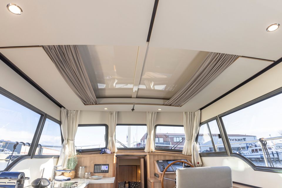 Linssen 35 SL Sedan - Silvana Ein schickes und geräumiges Open-Plicht-Modell von Linssen Yachts für 2 Personen aus der neuesten Sport Luxury-Serie. Ein sehr charmantes Modell mit offenem Cockpit, ideal für die friesischen Gewässer! Auf dieser kompakten Yacht gibt es überraschend viel Platz! Die Vorderkabine verfügt über eine gemütliche Kapitänskabine mit Doppelbett, Badezimmer mit elektrischer Toilette und Waschbecken sowie einen separaten Nassraum mit Dusche. Auf der Steuerbordseite befinden sich der Steuerstand und das Armaturenbrett, das mit einem kompletten Navigationspaket ausgestattet ist. Über der Küche und dem Steuerstand befindet sich eine schiffsbreite Schiebeluke, die das „Outdoor-Steuergefühl“ unterstreicht. Die Kombüse befindet sich auf der Backbordseite und ist komplett ausgestattet, unter anderem mit einem Herd, einer Nespresso-Maschine und einem kompletten Kücheninventar. Im hinteren Bereich befindet sich dann die Lounge mit einem großzügigen Sofa und einem verschiebbaren Esstisch. Gegenüber befindet sich viel Stauraum und der Fernseher. Der Salon ist mit großen Terrassentüren ausgestattet, die Zugang zum offenen Cockpit bieten, wo sich ein geräumiges Sofa befindet. Dieses Cockpit ist abschließbar und beheizbar, für viele angenehme Stunden an Bord.