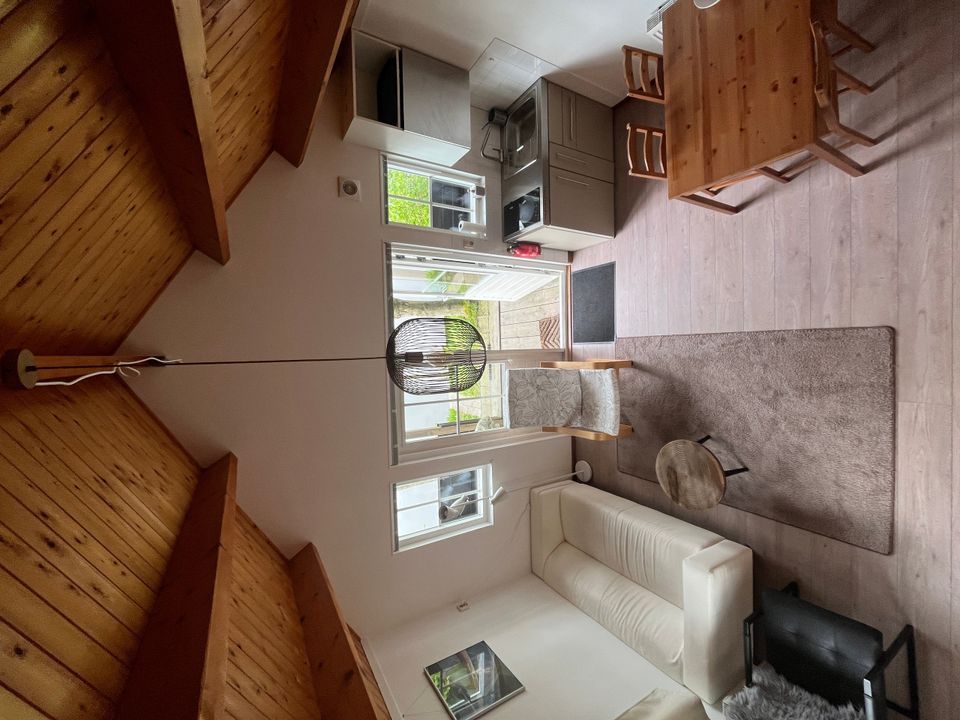 Das Haus verfügt über ein offenes Wohnzimmer mit Küche und Esstisch für vier Personen. Auch ein Badezimmer mit Dusche und Toilette. Im Erdgeschoss befindet sich ein Schlafzimmer mit einem Doppelbett. Das zweite Schlafzimmer ist ein Loft neben dem Wohnzimmer, das nicht abgeschlossen werden kann. Durch die französischen Türen betreten Sie die Veranda mit Terrasse und haben einen schönen Blick auf die Landschaft.