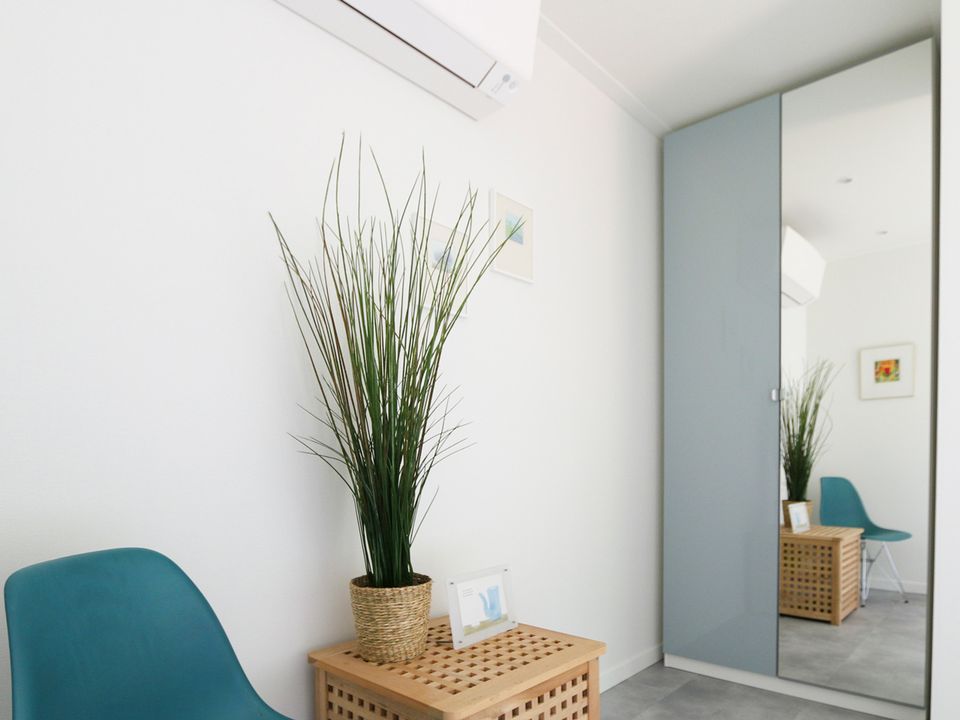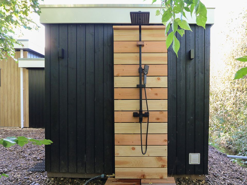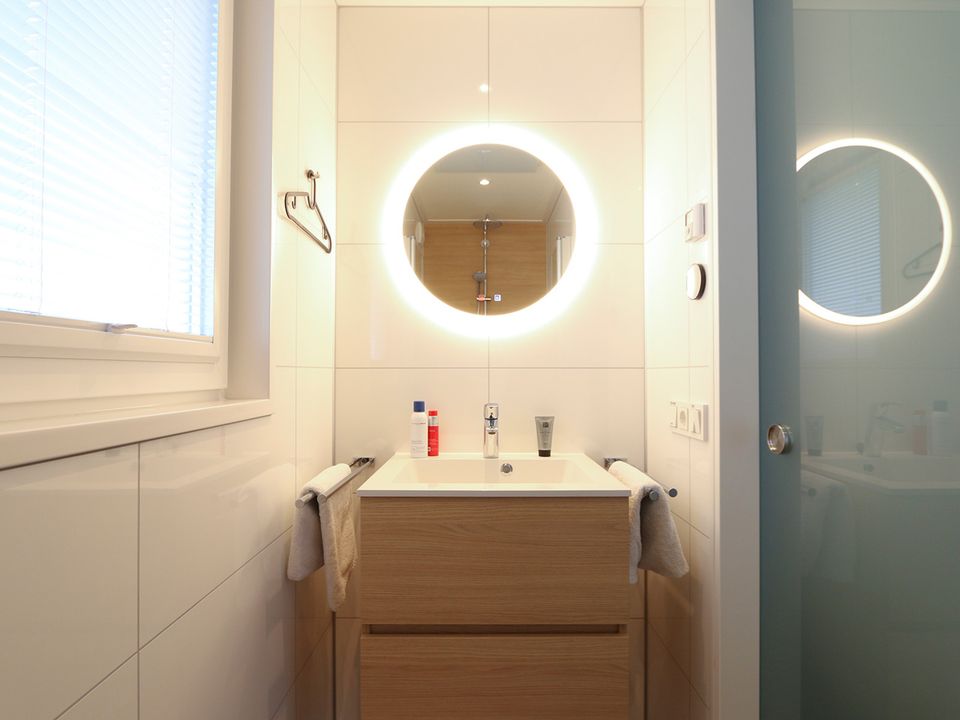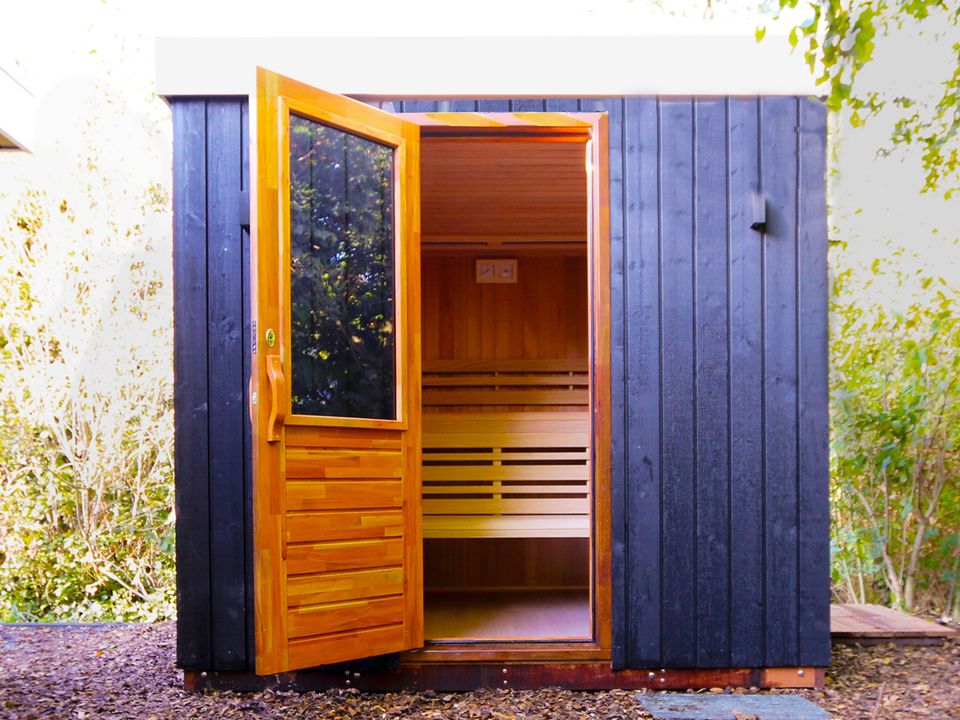 Diese Ferienhütte mit zwei Badezimmern ist gasfrei und verfügt über Klimaanlage und Fußbodenheizung. Es gibt auch eine Waschmaschine und einen Trockner. Die Außensauna mit Kaltwasserdusche ist optional für die Dauer Ihres Aufenthaltes buchbar. Die Sauna kann als finnische (Aufguss-)Sauna für 4 Personen oder als Infrarotsauna für bis zu 2 Personen gleichzeitig genutzt werden. Im kompakten, abschließbaren Fahrradschuppen können Sie Ihre Fahrräder sicher und trocken unterstellen.