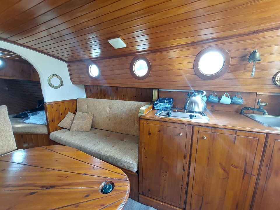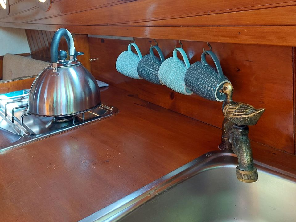 Steigen Sie an Bord dieses leichten und einfach zu segelnden Flachbootes. Das Boot verfügt über einen Dieselmotor, eine Küchenzeile und eine Toilette. Hinten gibt es zwei Betten, dort ist auch Platz für zwei kleine Kinder. Außerdem gibt es im Cockpit innen und außen jeweils eine Sitzecke. Der Swaen lässt sich entspannt segeln und segelt gut ausbalanciert.