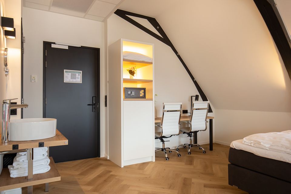 Spacious modern room, located in a monumental building with a view of the historic city center of the Elfstedenstad Bolsward. The room is located at the front of this small-scale hotel. It has a luxurious double box-spring bed (AVEK), a separate shower with a wonderful rain shower and mini Rituals, separate toilet and a pantry. The pantry has a refrigerator, sink, kettle, Nespresso machine and microwave. This makes this room very suitable for a longer stay. The room also has air conditioning, a flat screen, free WiFi and a safe. There is a luxurious armchair for relaxing and a spacious desk for working. In the tower there is a corner sofa with cushions where you can enjoy a luxurious breakfast and or enjoy the view over the city center.