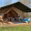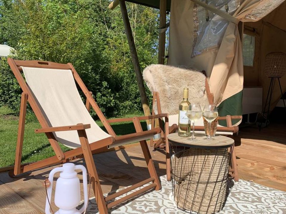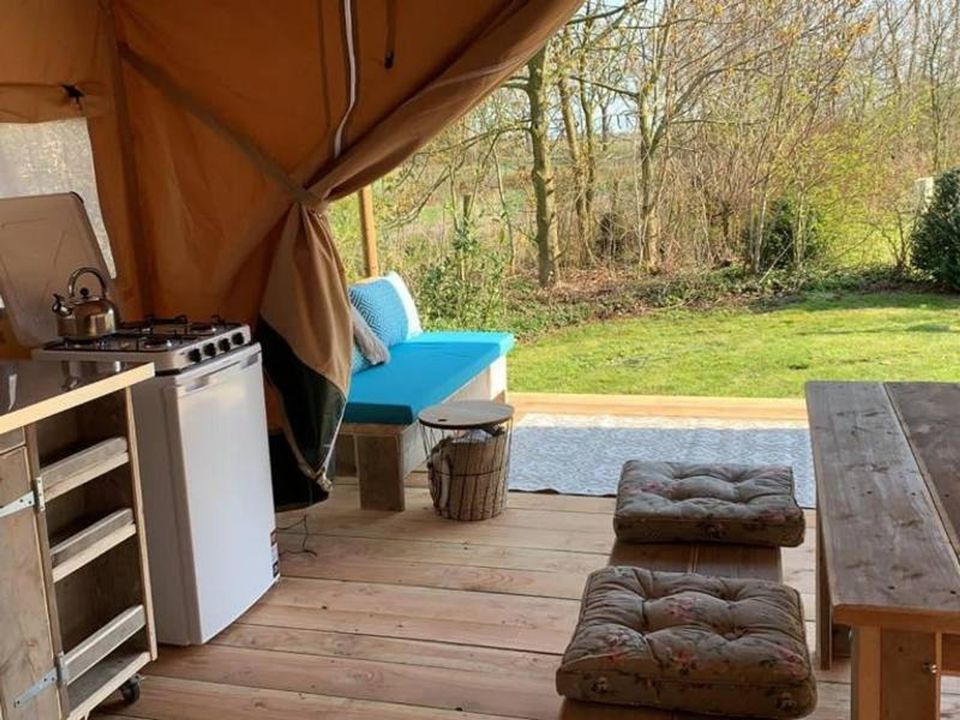 Comfortable sleeping, but still the feeling of camping. This glamping tent is suitable for five people and has two sleeping cabins. There is a sleeping cabin with a double bed and a sleeping cabin with a single bed and a bunk bed. You don't have to bring your own bed linen, it will be ready for you upon arrival! Inside the tent is a living room with a picnic bench and a kitchenette with a refrigerator, gas stove and coffee maker. In front of the tent you have a deck terrace with a lounge sofa and comfortable chairs.