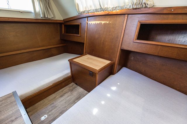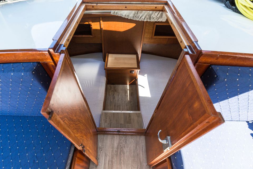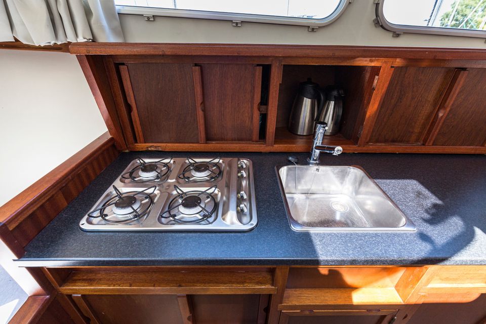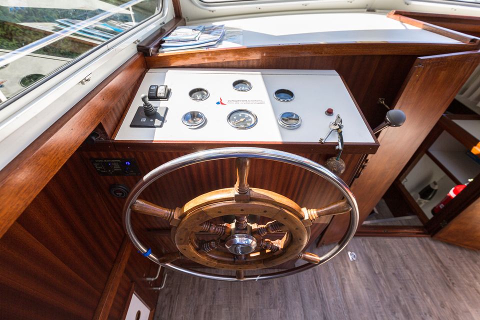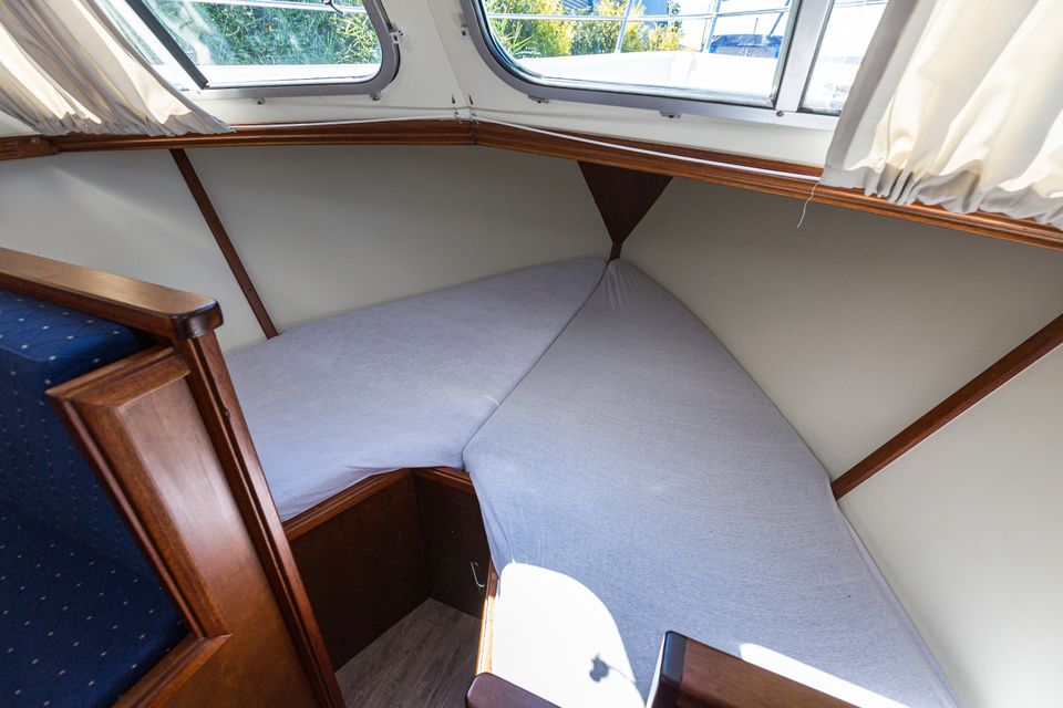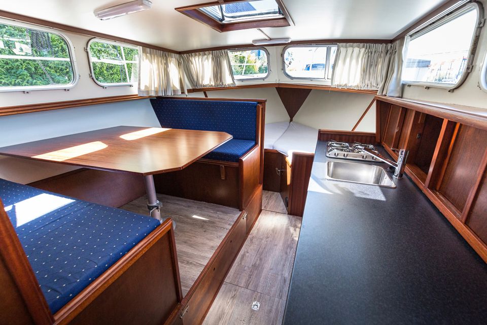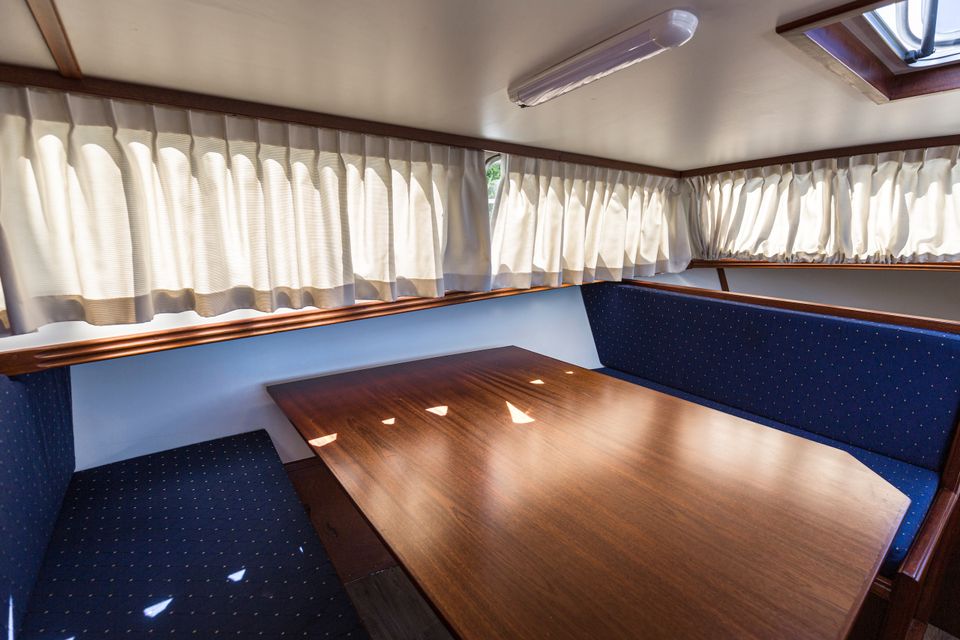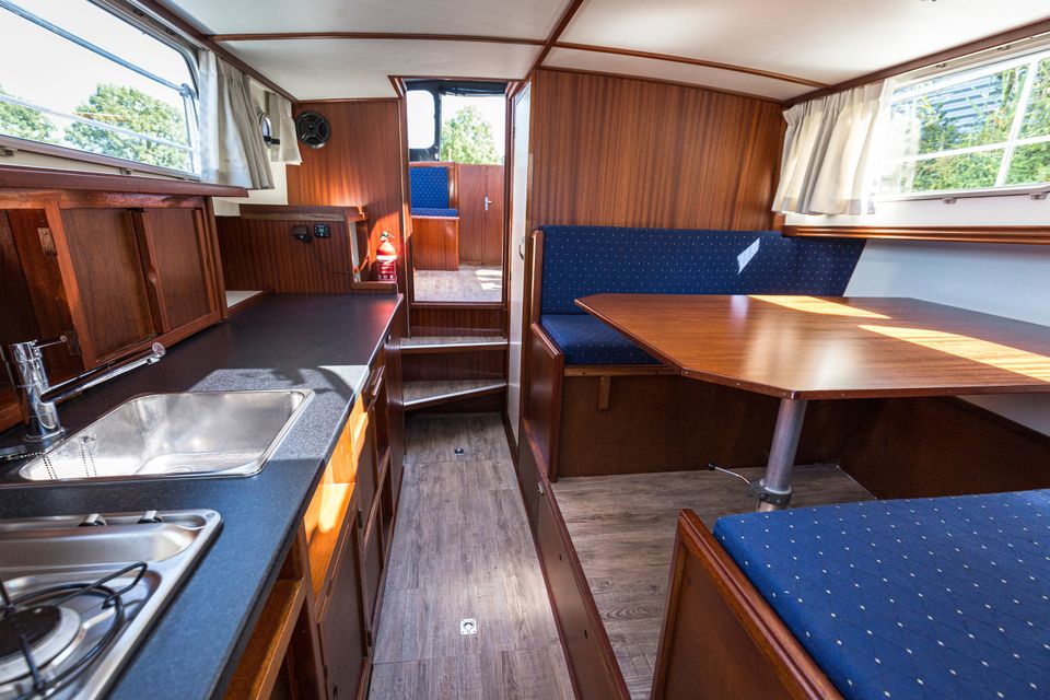 The cozy cabin is equipped with all conveniences. Kitchen with gas stove, sink with hot and cold water and refrigerator. The toilet is a separate closed space including a small sink with hand shower. The dinette can comfortably seat 4 people. The table can be folded so that the dinette can be converted into a double bed (2.20 x 1.40 m.). The bow of the boat is equipped with a double bed in V-shape (2.00 x 1.60 m.). Via a staircase in the wheelhouse you enter the spacious aft cabin which is suitable as a sleeping place for 2 people (2x 1-pers. bed).