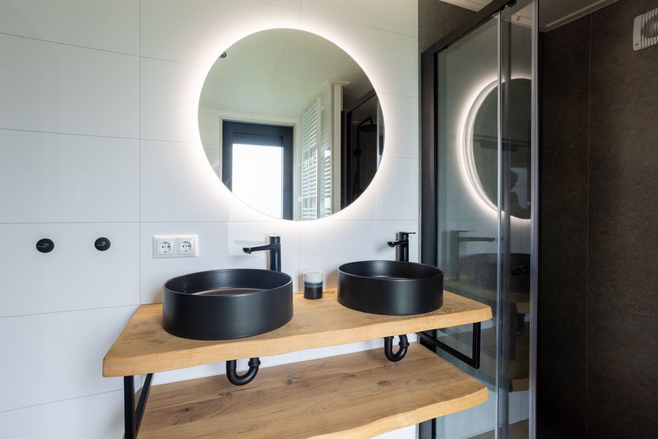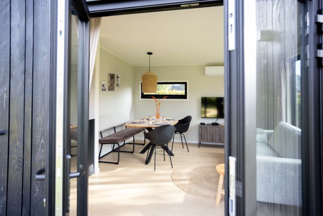 Krûswetter Lodge is a modern four-person holiday home overlooking the harbor. The single-story house features a cozy living room with a sitting area, smart TV, and dining area. The open-plan kitchen is fully equipped with an induction cooktop, combination microwave, dishwasher, and refrigerator with freezer compartment. There are two bedrooms: one with a double bed and one with two single beds. The bathroom has a spacious rain shower and a separate toilet. Outside, you can relax on the sunny southwest terrace with a lounge sofa and chairs.