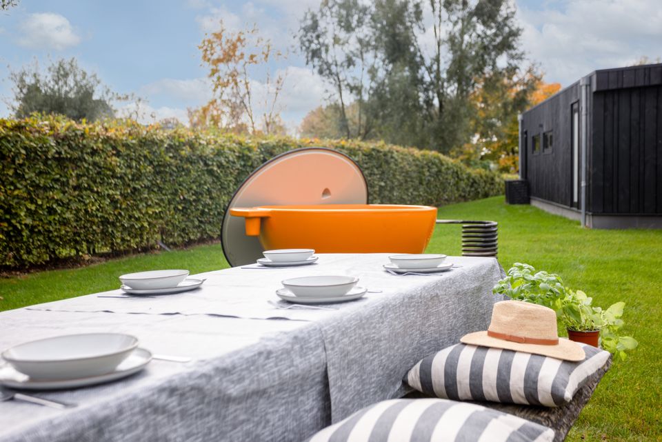 This accommodation features a lovely terrace and a spacious surrounding field. The terrace is furnished with a lounge sofa, chairs, and a picnic table. All types of barbecues, such as a green egg and pizza oven, are available for rent. A hot tub is available for rent at the property, perfect for a fun family experience.