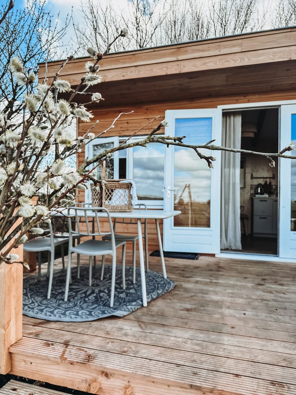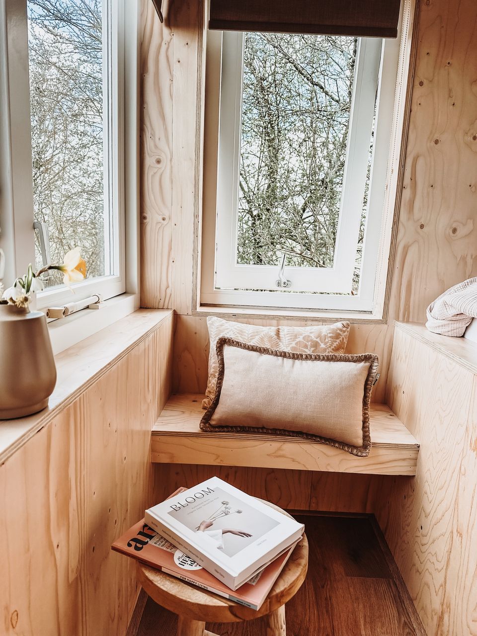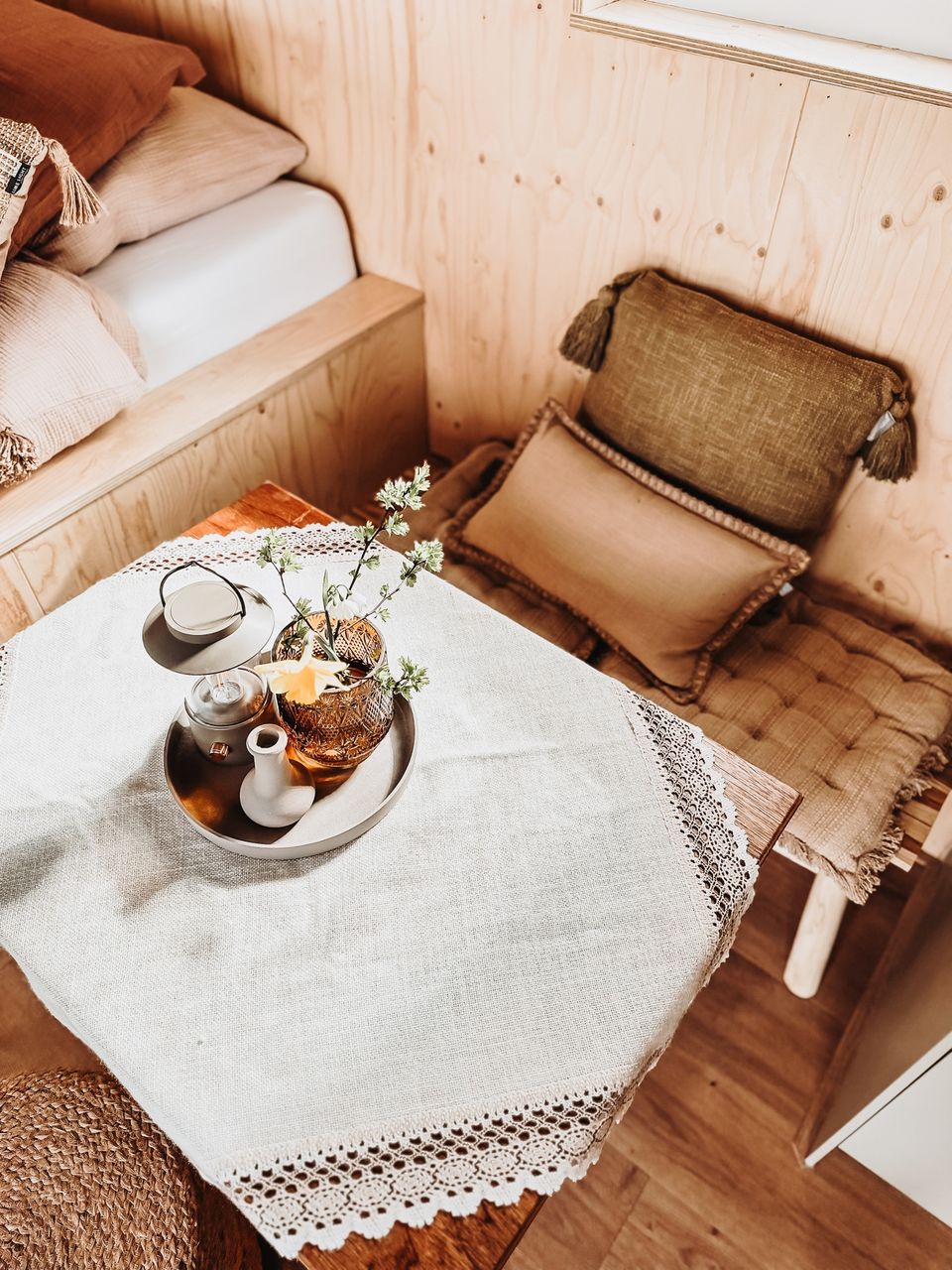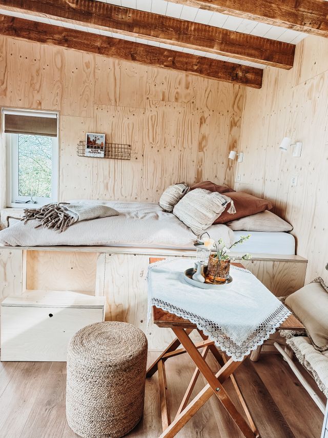 Inside, the decor is light and natural, with plenty of wood, soft colors, and a warm atmosphere. There's a sitting area with a bench covered in cushions, and a compact kitchen with a stovetop, refrigerator, and all the necessary kitchenware. A shower and toilet are available, and the beds are already made upon arrival. Towels and kitchen linens are also provided. Thanks to the underfloor heating, you'll always be comfortable – even on a chilly morning.