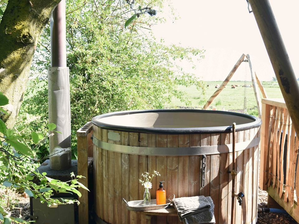 Outside, enjoy panoramic views of the Frisian meadows from the wooden veranda. The cottage includes a hot tub. Start your day with a cup of coffee in the sun or end it by the fire with candles and good conversation. An added bonus: you can even cook outdoors on an open fire.