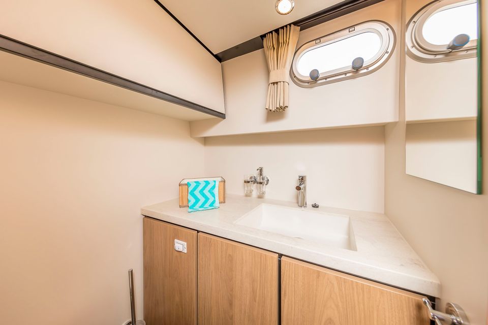 There are two sleeping quarters on board, the first of which is equipped with a spacious double bed (160x200) and the second bedroom has a slightly smaller double bed (140x200). Both bedrooms have en suite bathroom facilities, which consist of a toilet and sink. There is also a separate shower room. There is enough hot water through the boiler.